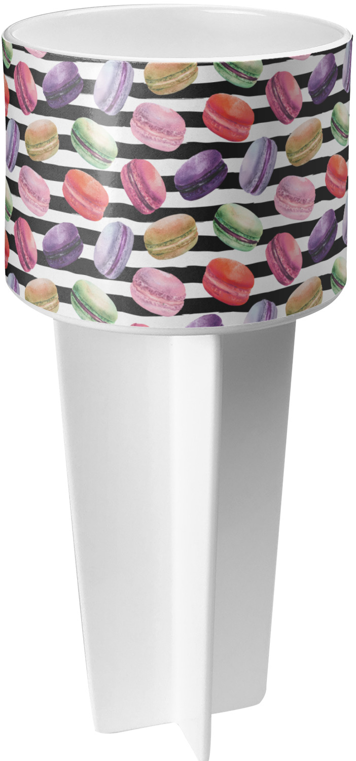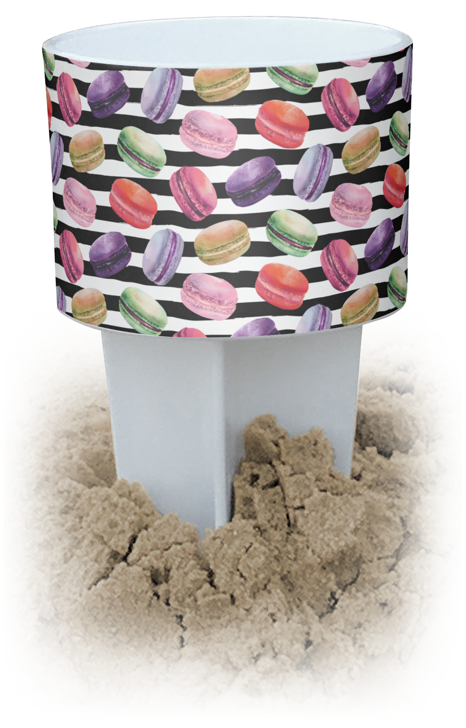 This cup holder has a large stake at its bottom that anchors it to the sand or ground below, while the cup holder rests above the stake. The entire drink holder is made of durable plastic and displays your customization around the cup holder portion. We sell these personalized beach spikers in two different colors: black and white.