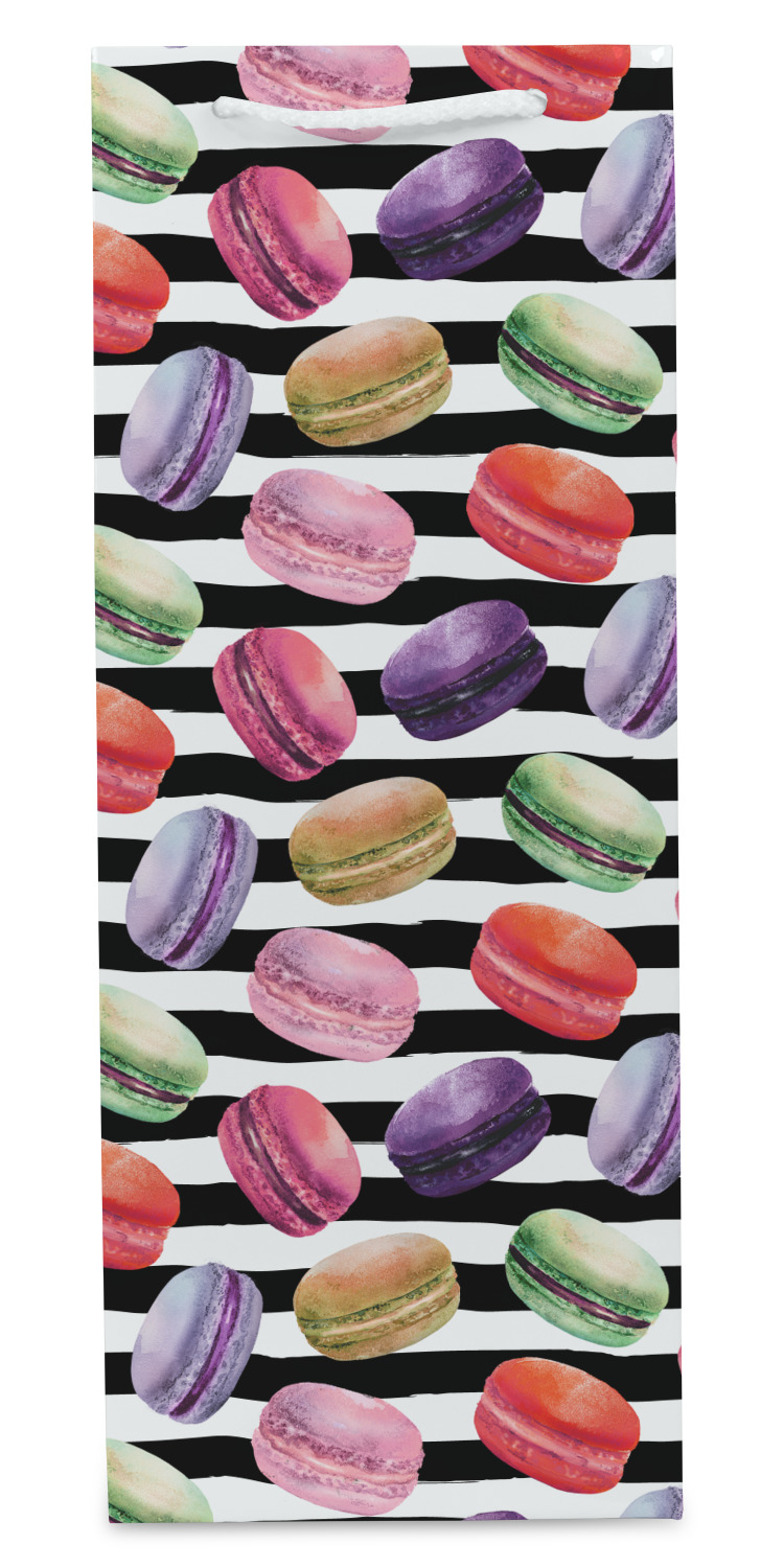 This design simply has the adorable macaron pattern with a striped pattern behind it. You are easily able to add any content you wish to personalize it. The macarons are all different fun colors. You will see green, purple, yellow, red, and pink. The stripes directly behind them are black and white. This design is perfect for any macaron lover or foodie. They will be sure to brighten up your life.