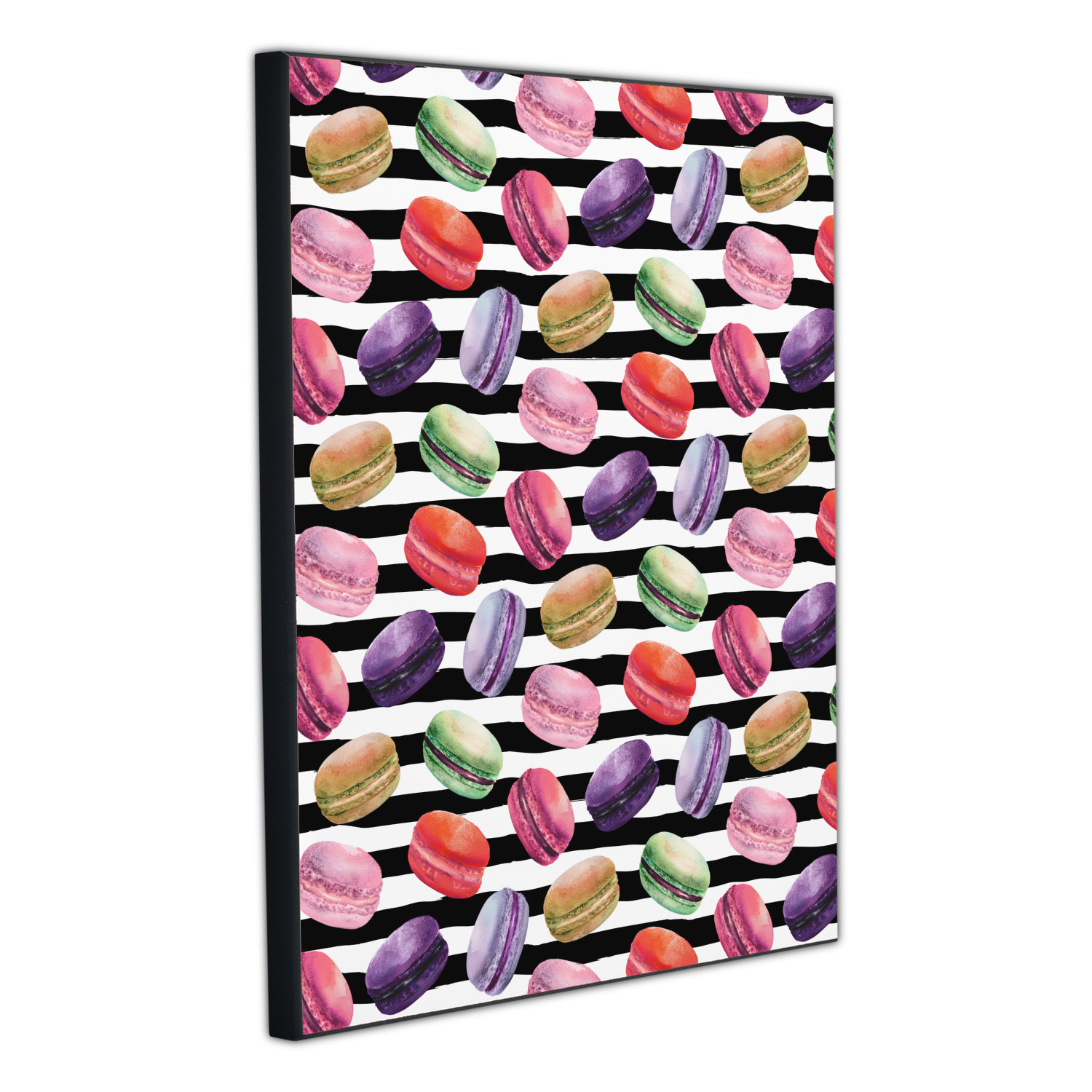 This design simply has the adorable macaron pattern with a striped pattern behind it. You are easily able to add any content you wish to personalize it. The macarons are all different fun colors. You will see green, purple, yellow, red, and pink. The stripes directly behind them are black and white. This design is perfect for any macaron lover or foodie. They will be sure to brighten up your life.