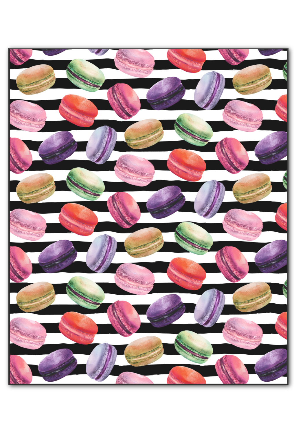 This design simply has the adorable macaron pattern with a striped pattern behind it. You are easily able to add any content you wish to personalize it. The macarons are all different fun colors. You will see green, purple, yellow, red, and pink. The stripes directly behind them are black and white. This design is perfect for any macaron lover or foodie. They will be sure to brighten up your life.