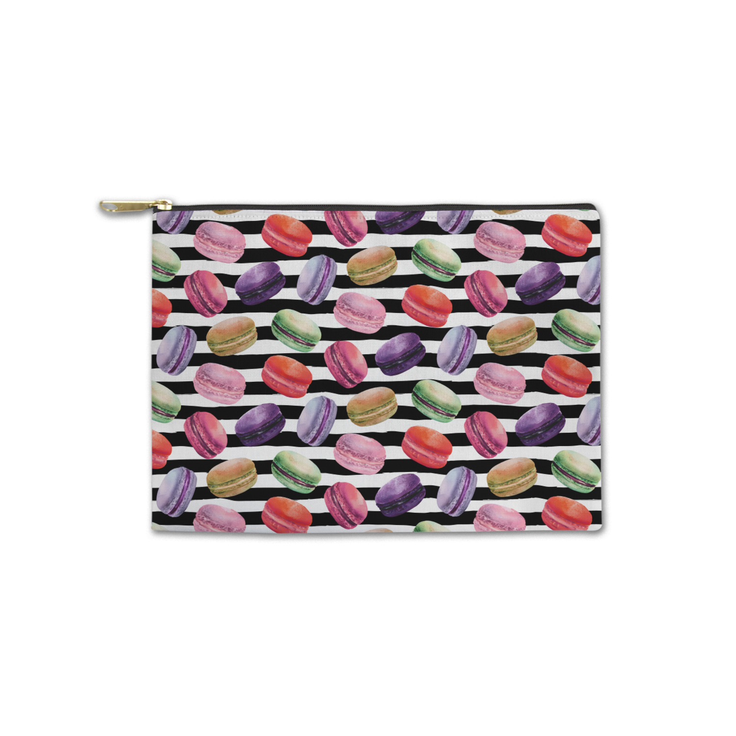 This design simply has the adorable macaron pattern with a striped pattern behind it. You are easily able to add any content you wish to personalize it. The macarons are all different fun colors. You will see green, purple, yellow, red, and pink. The stripes directly behind them are black and white. This design is perfect for any macaron lover or foodie. They will be sure to brighten up your life.