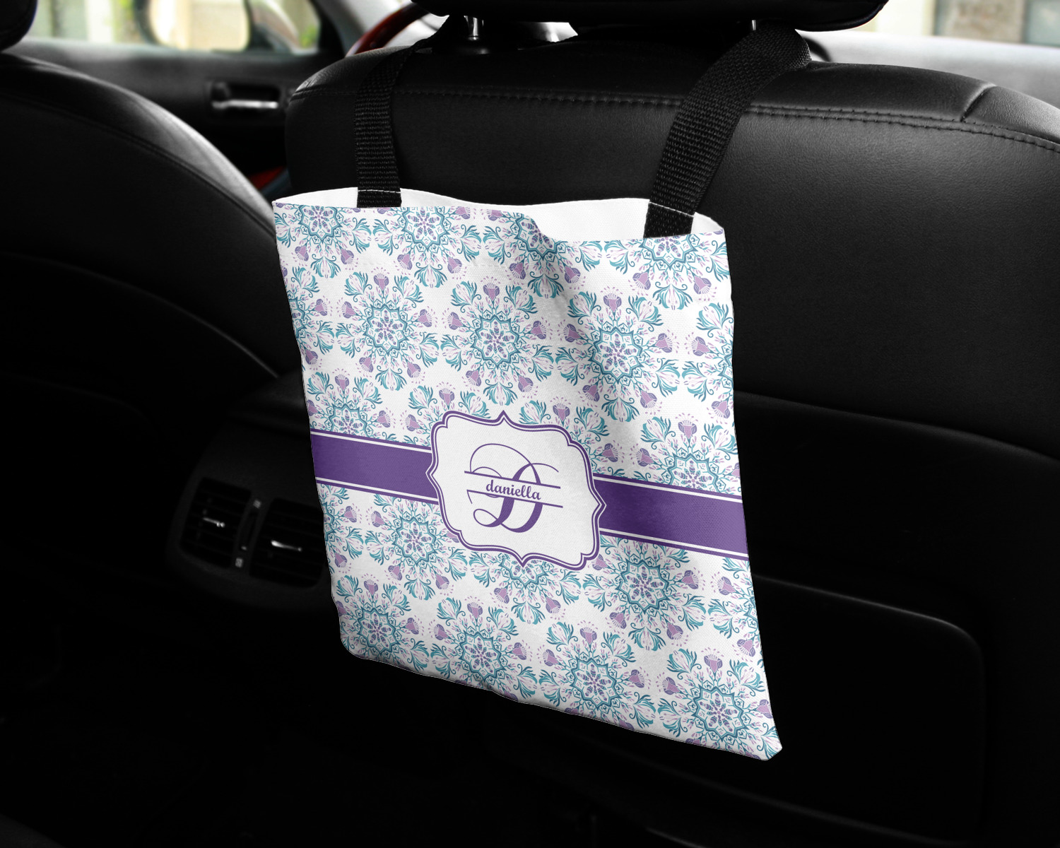 These car back seat organizers are sturdy tote-like bags, fabricated from a robust polyester, and features a single handle on the back side. The strap features an attachable velcro for easy attachment to headrests, grocery carts, car seats, and more. Simply undo the velcro, loop the strap around the headrest, reattach the velcro, and let the organizer hang from the front seat. These car organizers are the perfect means of increasing your backseat's legroom, while storing multiple items in one place for better accessibility. Each car back seat organizer measures at 10 by 10 inches, and features your personalized design printed across its front and back.