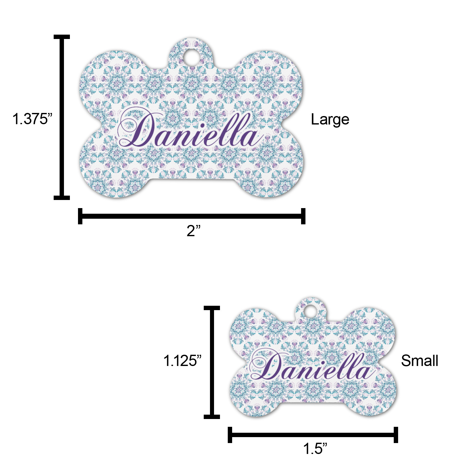 The small bone dog tag size is perfect to pair with our small dog collars, the large size pairs well with our large dog collars.