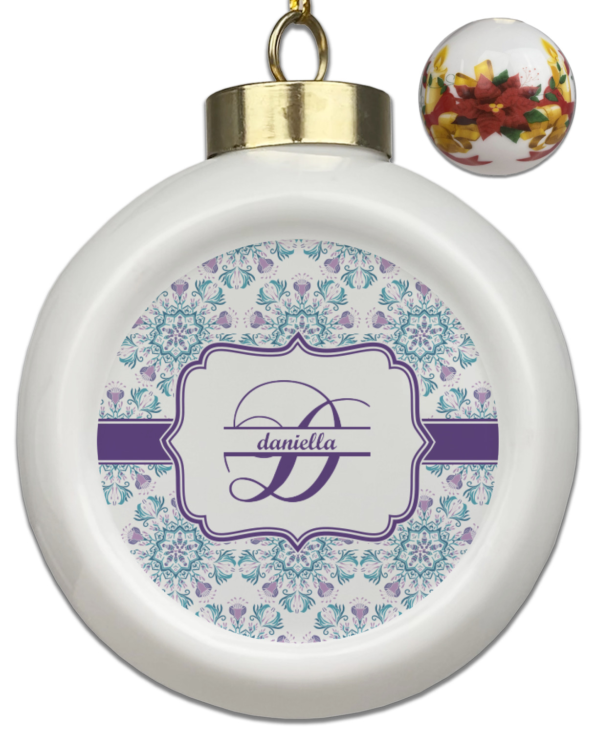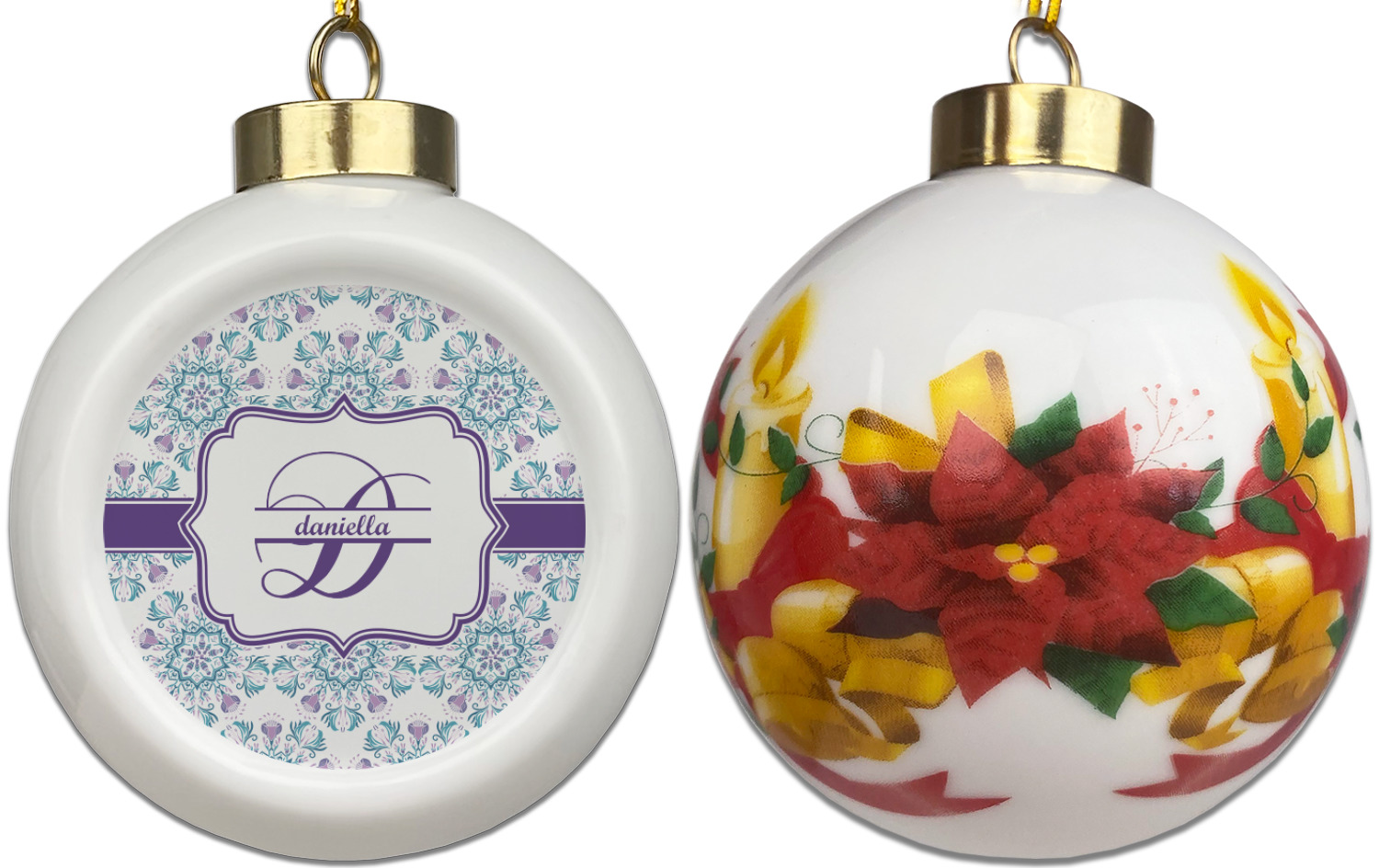 Our Christmas ornaments are a unique ceramic ball shape with a twist as it has a flat face to display your custom design! Select from one of our two design types - Christmas Tree or Poinsettia Garland - to adorn the curved back of your personal design. Each ornament measures 3H x 2.5W x 2D accompanied with a gold string accent for finishing touches to hang on your beautiful Christmas tree!