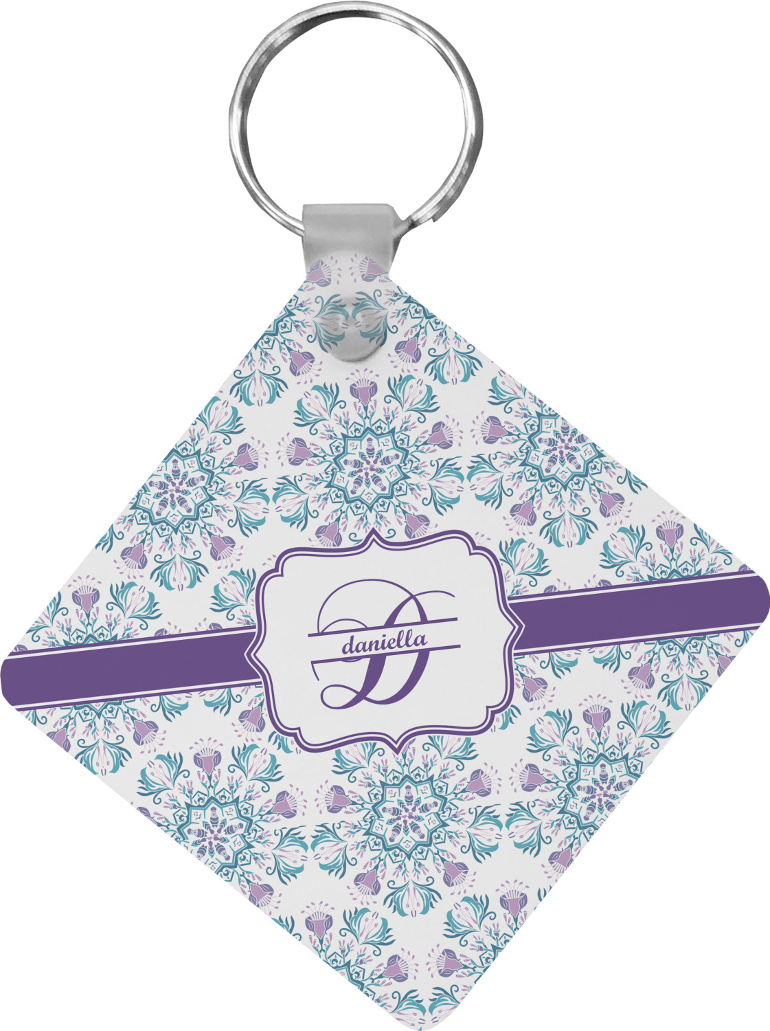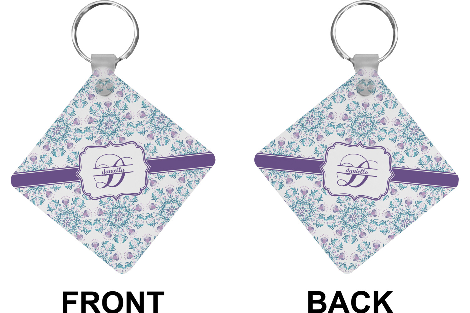 Our personalized keychains attach to the included metal, split key ring with a plastic, removable snap. Since a metal ring is included with your purchase, you have the liberty to keep your keys together on the ring, with or without your unique keychain. We offer this keychain in three different shapes: circle, heart, or diamond. We print your personalized design(s) on both sides of the key chain, and the surface has a glossy, reflective finish that only emphasizes your design. Each keychain is approximately 2.25 by 2.25 inches.
