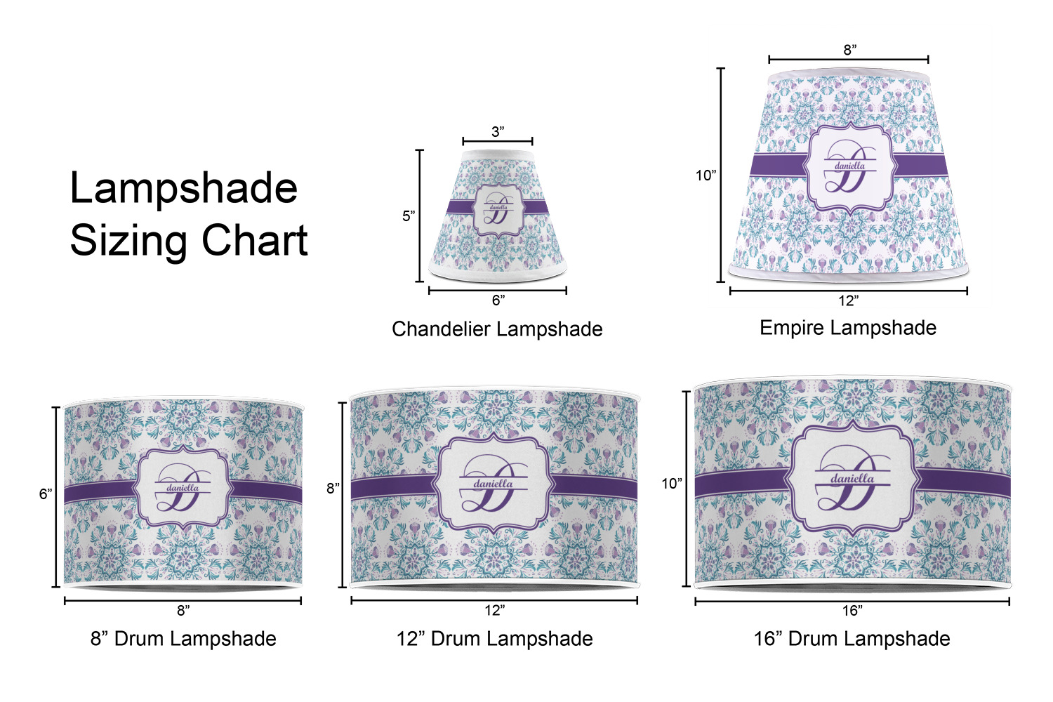 Our customized lamp shades also come in 3 different sizes: 8", 12" and 16", measuring at 8" in diameter by 6" tall, 12" in diameter by 8" tall, and 16" in diameter by 10" tall, respectively.