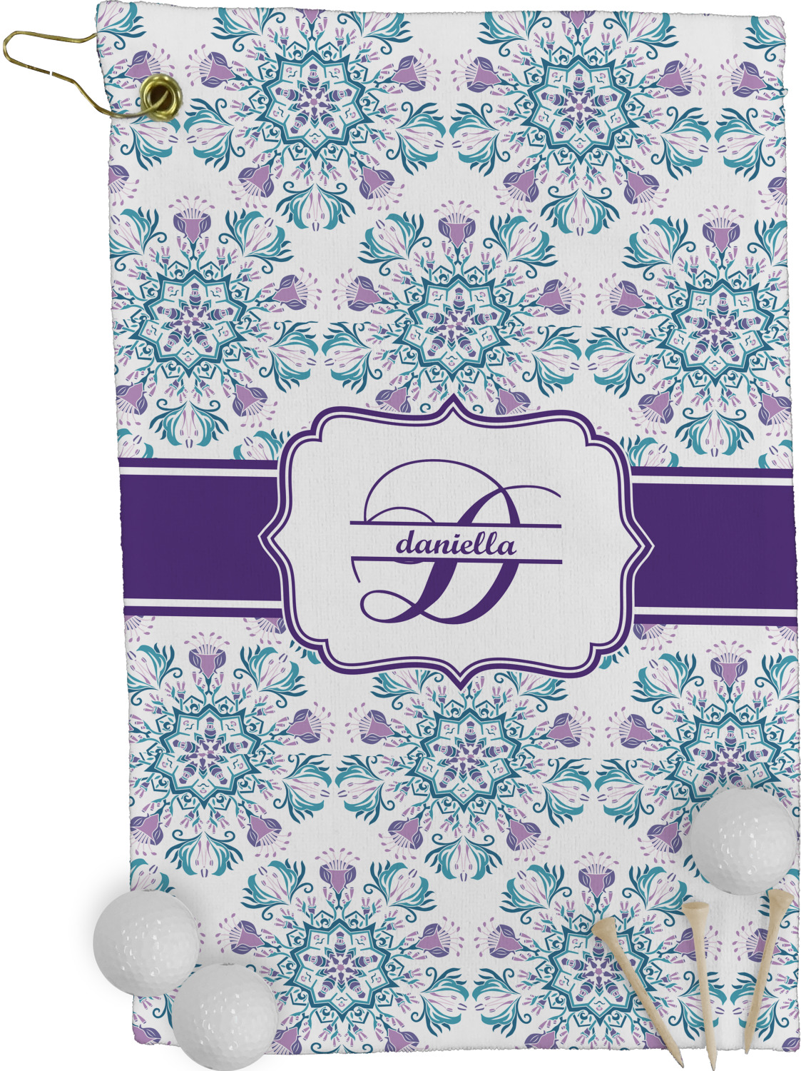 The towel is fully printed / patterned on the front polyester side; and is white on terrycloth cotton backside. The towel has grommet and a pear spring clip in the top left corner. Our golf towels are available in 100s of different prints and patterns.