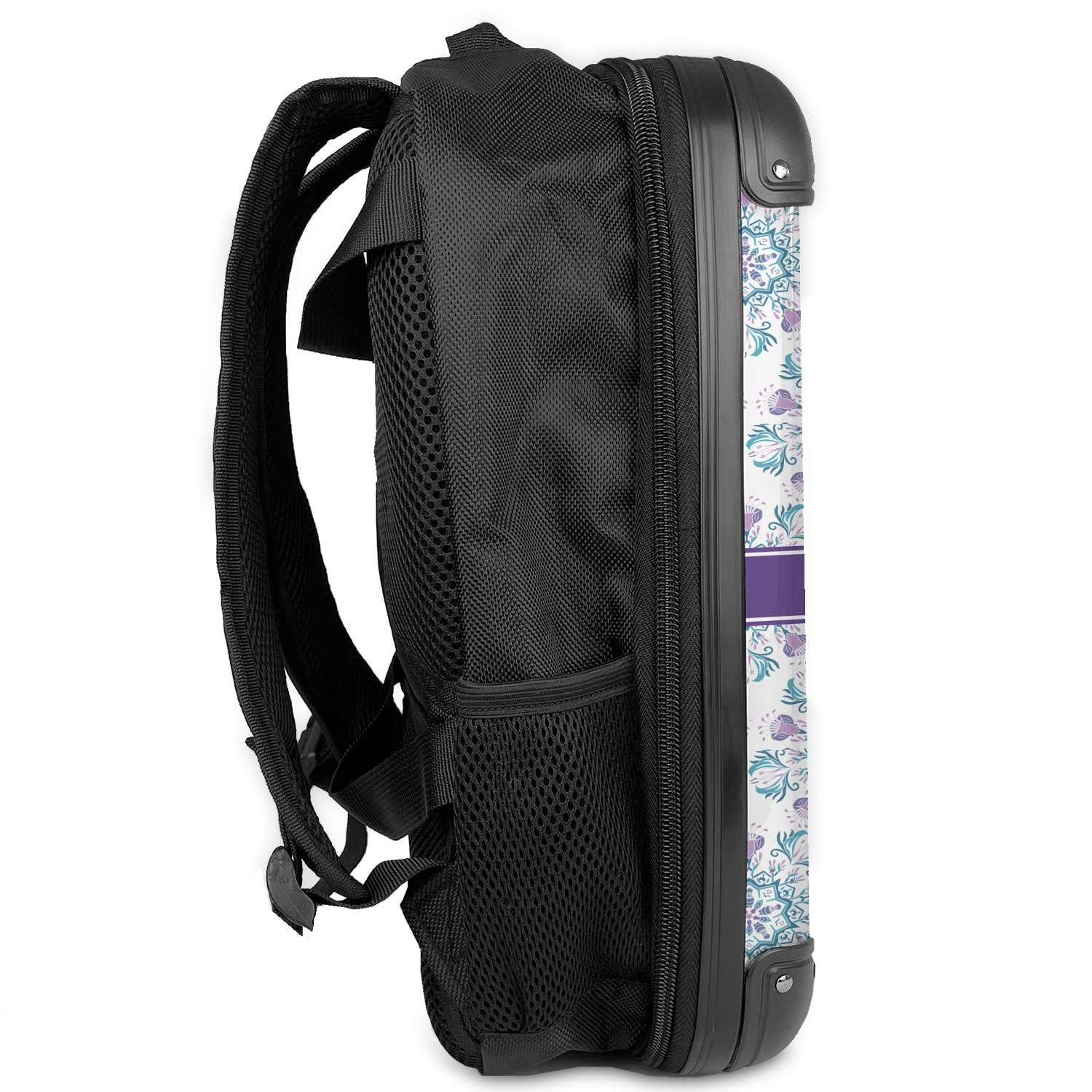 On the top of the backpack there is a handle for ease of carrying if needed. There are two velcro flaps to allow you to open the backpack fully flat if you desire. On the back are adjustable straps for wearing it on your back as well as two loop straps to slide it over a luggage handle for easy travel. The back is also lightly padded to ensure comfort for the wearer. There are two small mesh pockets on each side of the backpack.
