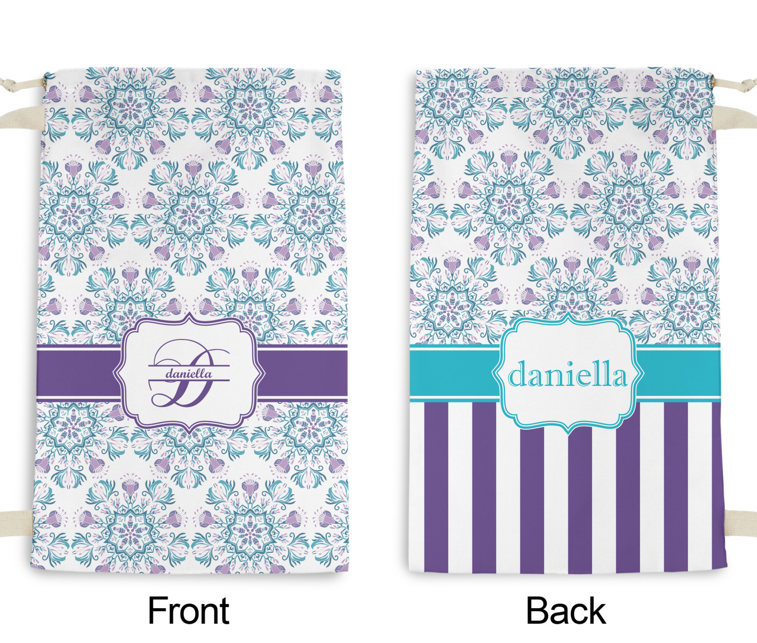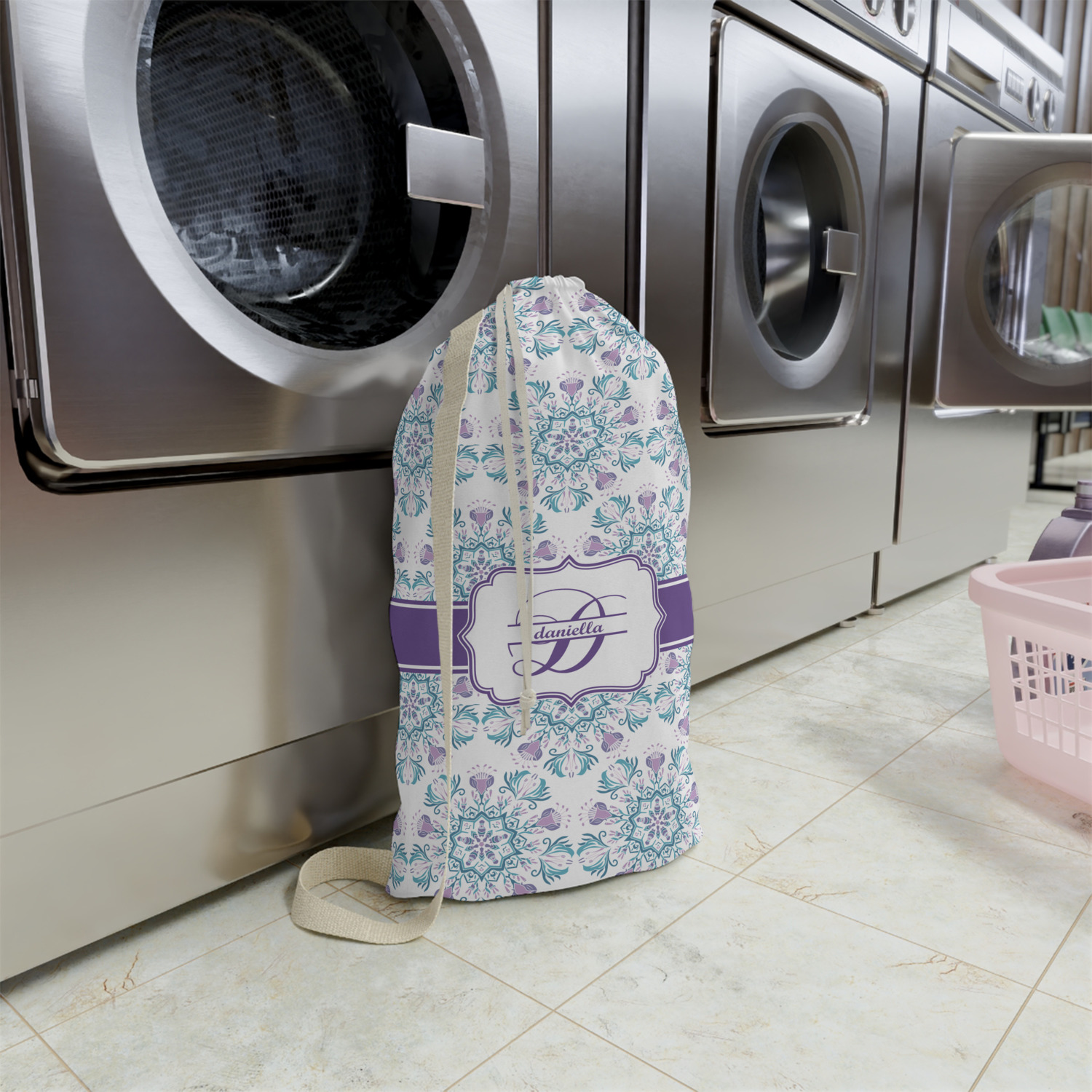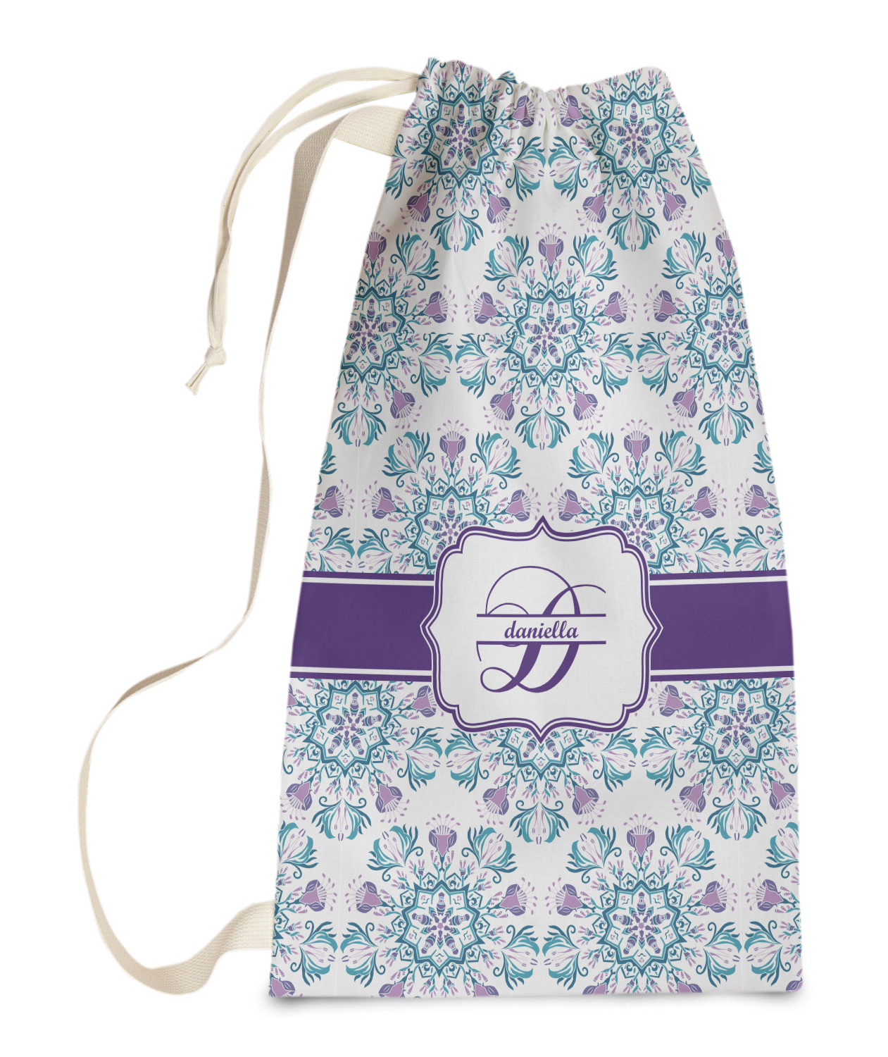 Carry your laundry in style with these customized laundry bags. Available in two sizes, featuring a natural colored woven strap and a cinch cord, these bags hold a lot of clothes or anything else you want to fit in them.