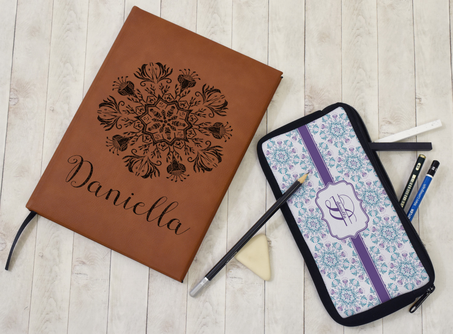 The faux leather covers are a rich cognac / rawhide color and can be customized with your design. From a simple name or monogram or a logo to a detailed mandala - the choice for customization & personalization is truly yours. Customize one of our designs or upload your own.