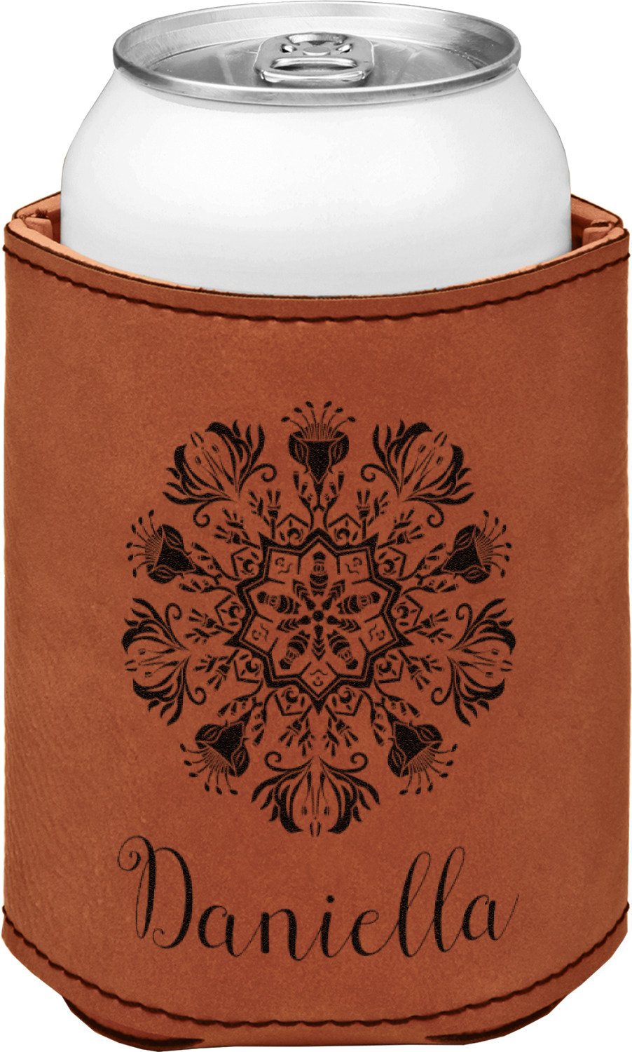This can sleeve is made from a cognac-brown leatherette and stitched with a sturdy, black thread. A slim padding lines the inside of your can sleeve to allow for a better fit once your drink is inserted. The sleeve itself measures at 4 by 4.5 inches, allowing this custom can sleeve to accommodate most canned drinks. Your personalized design can be engraved on the front and back, or solely the front. When laser-engraved, your design appears as a black coloration which contrasts the leatherette nicely.