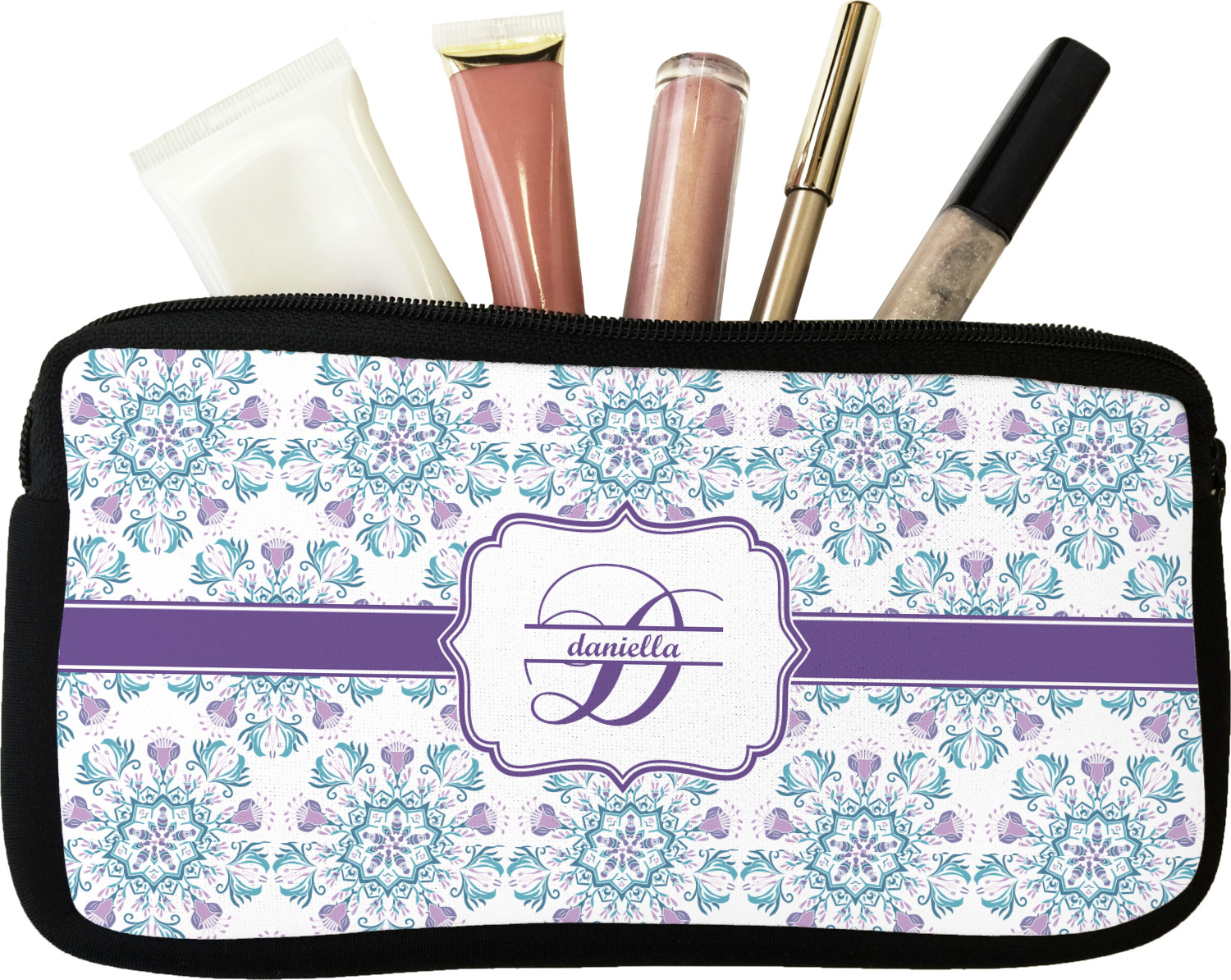 Our personalized makeup bags are available in many different designs, patterns and colors - so you are sure to find one that will love. They are made of neoprene (same material as wet-suits) and thus are water resistant, so spillages in your makeup bag will not end up all over you purse. They are customized on one side and are black on the other side and the zipper is black as well.