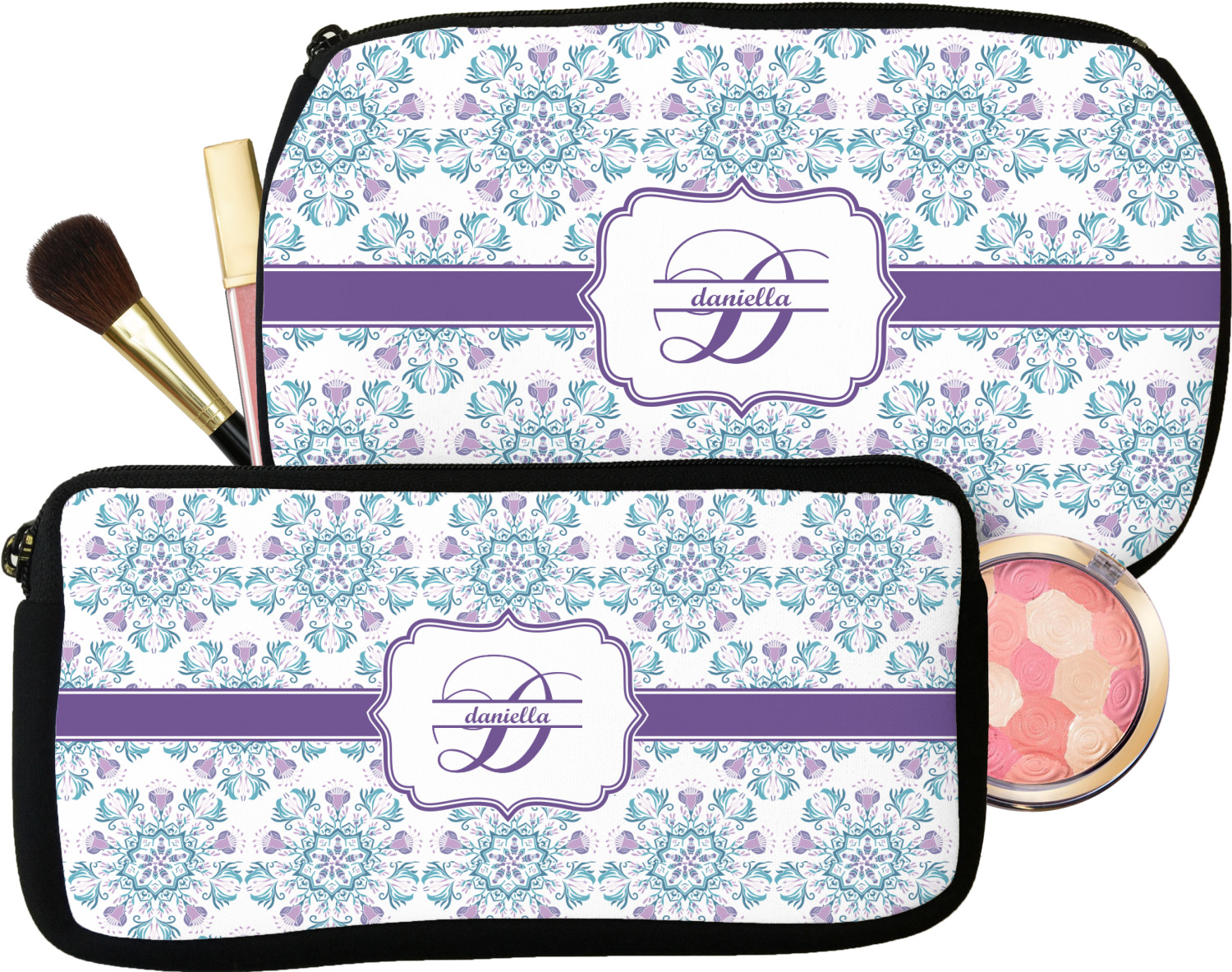 Every girl and woman carries makeup and cosmetics in her purse. Why not carry your makeup in these beautiful custom made and personalized makeup bags. These cosmetic bags also make a great bridesmaid gift.