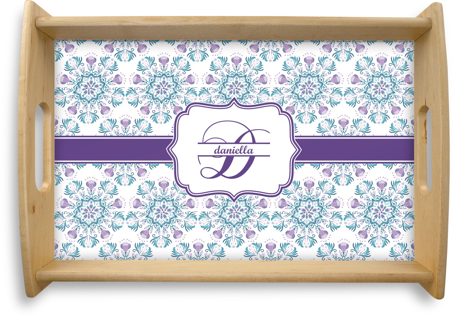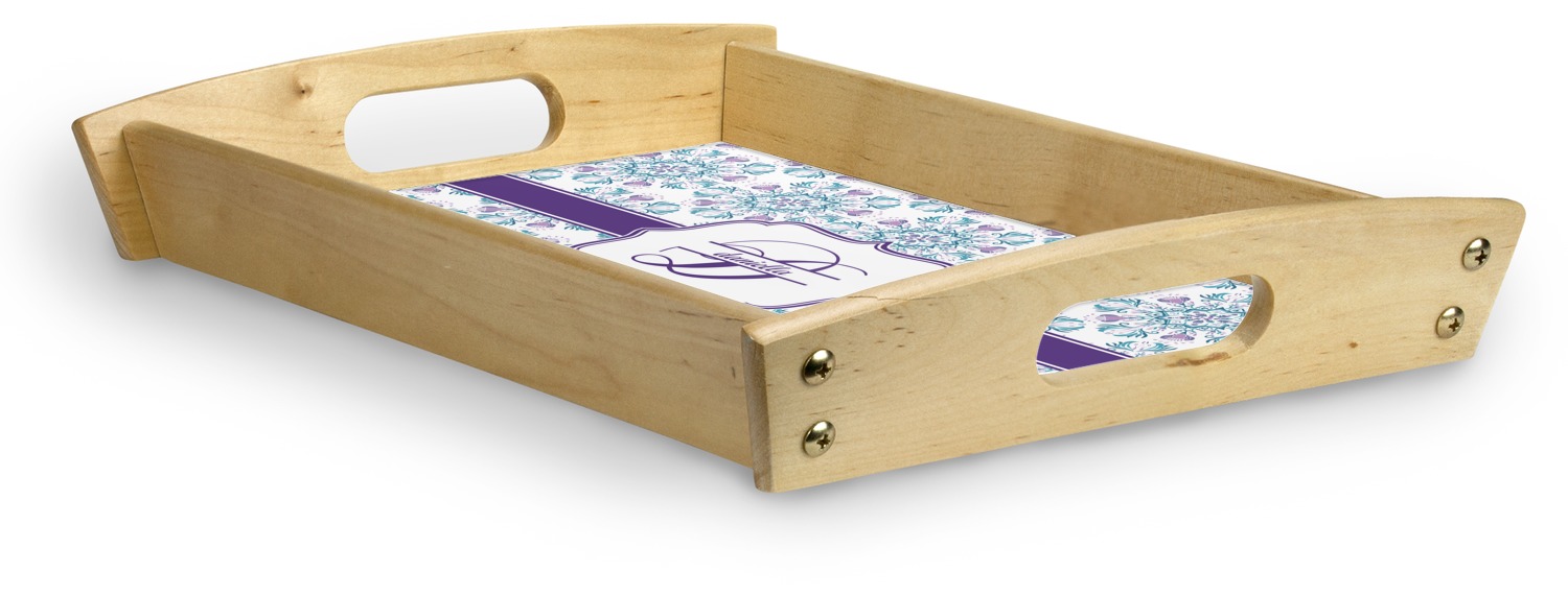 This serving tray with handles features square edges and two rounded sides, creating a very modern look. Each side is fabricated from a beautifully cut, natural wood. The bottom of the interior of the tray displays your customized design in bright, vibrant color. The tray is sold in both a black color and a natural wood look. Each variation of the wood serving tray has two sizes: Small, which is 14" x 10" x 2.25", and Large, which is 19.5" x 13.5" x 2.75".