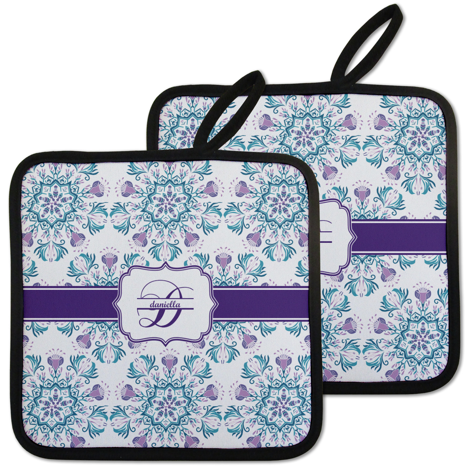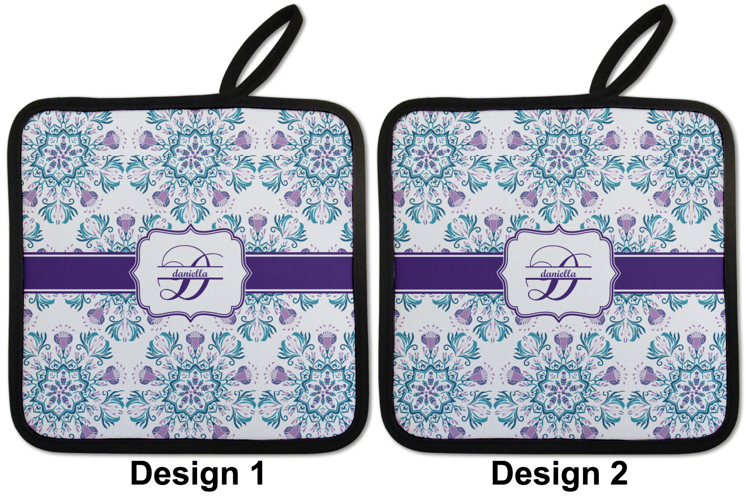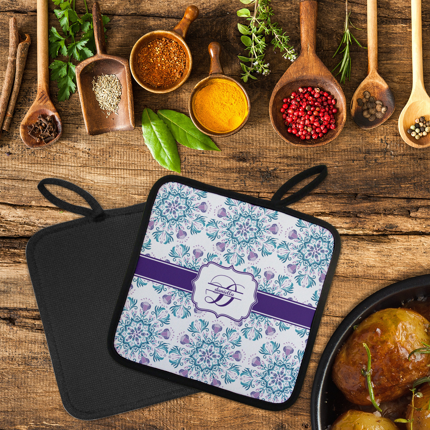 Our personalized pot holders feature a neoprene front that displays your personalization in vibrant colors. The backing of the hot pot holder is rubberized; the textured backing allows you to have a great grip when using this custom pot holder. The two materials are joined with a sleek, black trim, and the holder also includes an attached loop for hanging and storage. The pot holder is approximately 8.75 inches by 8.75 inches and 0.25 inches tall, while the fabric loop is 2.5 inches long. You can purchase a kitchen pot holder by itself or as a set of 2. We also offer a set including one pot holder and one oven mitt.