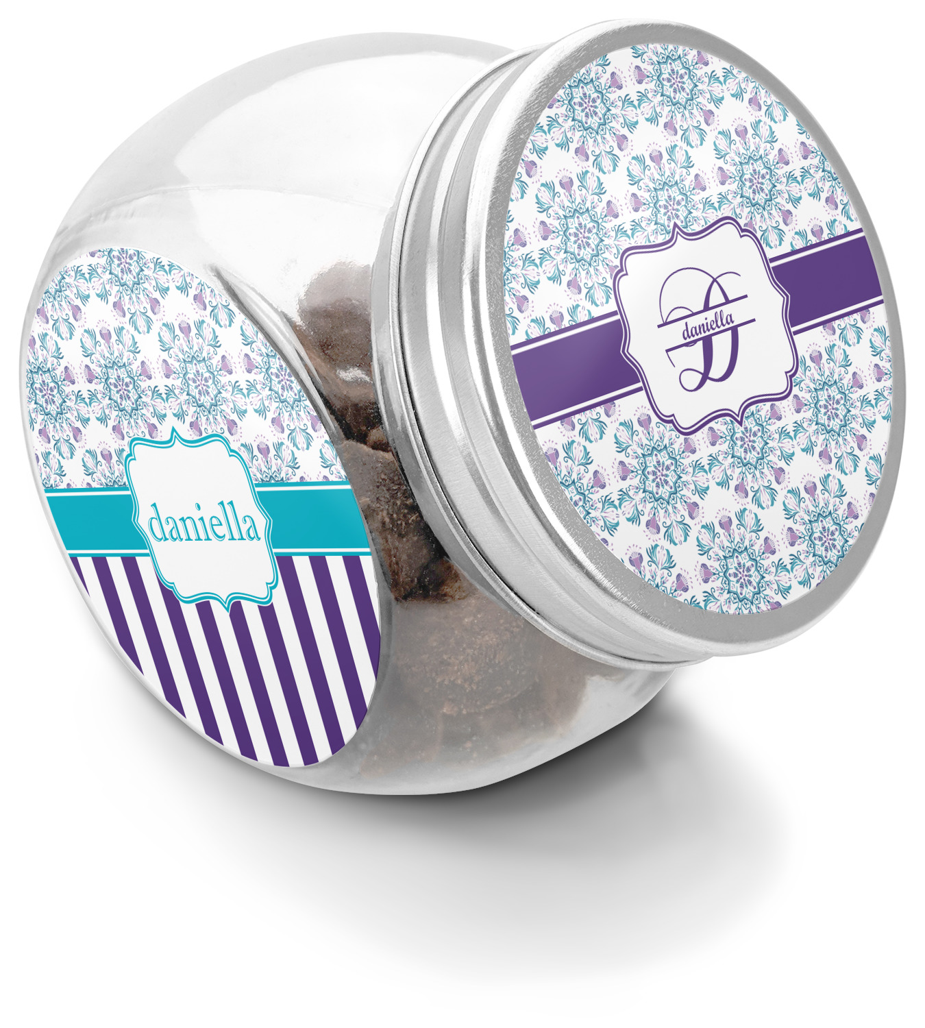 This treat jar is an excellent way to store treats for your favorite canine or feline. Moreover, their delicate, classy appearance makes them a tasteful addition to your countertop's décor. Crafted from clear glass, its unique construction and silver metal, screw-on lid allows for quick and easy access. Three, permanent, vinyl stickers are applied to both sides of the jar and lid, presenting your personalized design. The base of this glass, dog treat jar is 3.4" x 4.75", and the jar stands at 5" tall. Though on the smaller side, this jar is best suited for smaller treats or training treats.