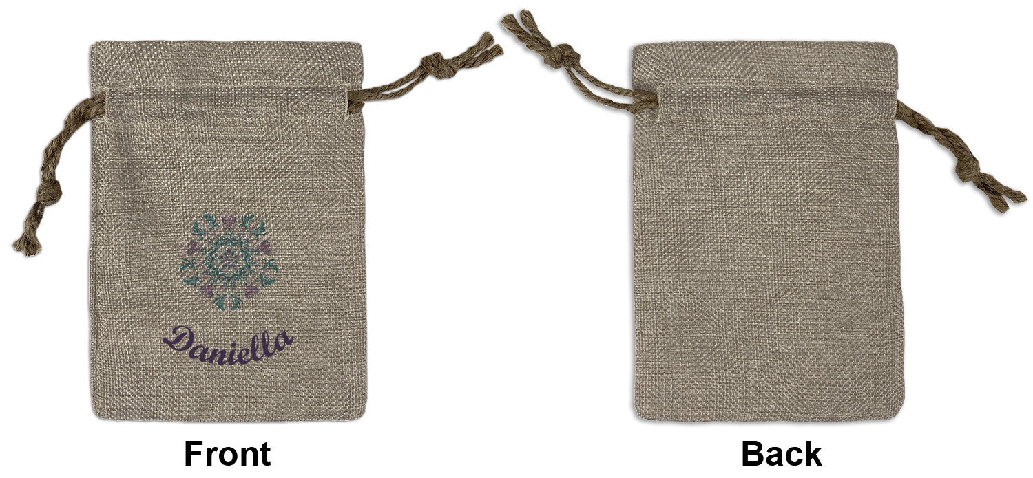 We sell our Burlap Gift Bags in 3 variant sized bags. Made with burlap polyester, each personalized bag can be secured with a twine drawstring pull. Your custom design is available to print on one side or both sides - completely up to you! The sizes of the bags measure approximately 4.5" x 6.5" for the smallest size, 6.5" x 8.0" for the medium size, and 6.5" x 13.5" for the large-sized bag.