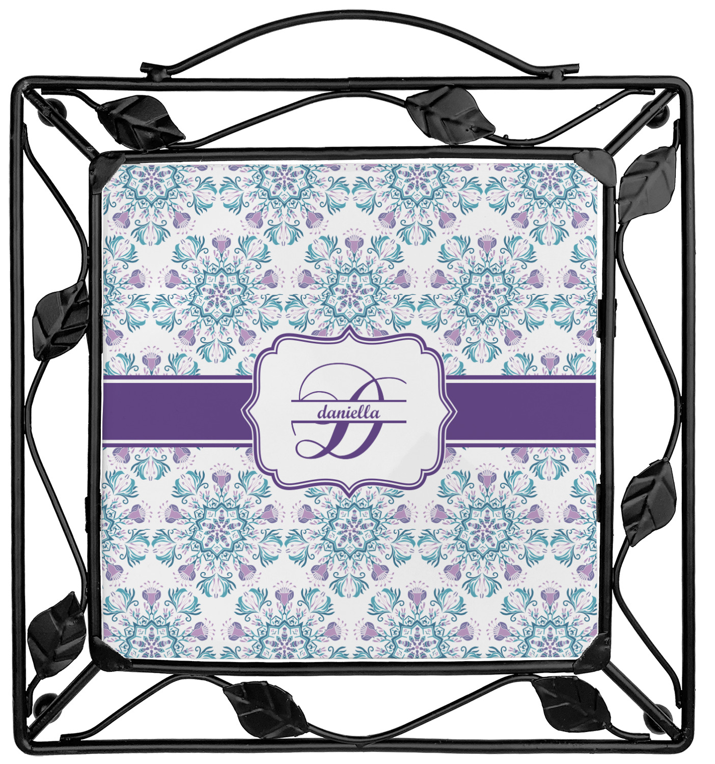 Our square trivets are made from a durable, wrought iron. This model features 4 small half circles, one on each corner, and a larger ring of iron that circles the central, customized tile. Each of the 4 corners has a round foot on its bottom for stability. This trivet is 8.75 by 8.75 inches, but the central tile measures at 6 inches on both sides.