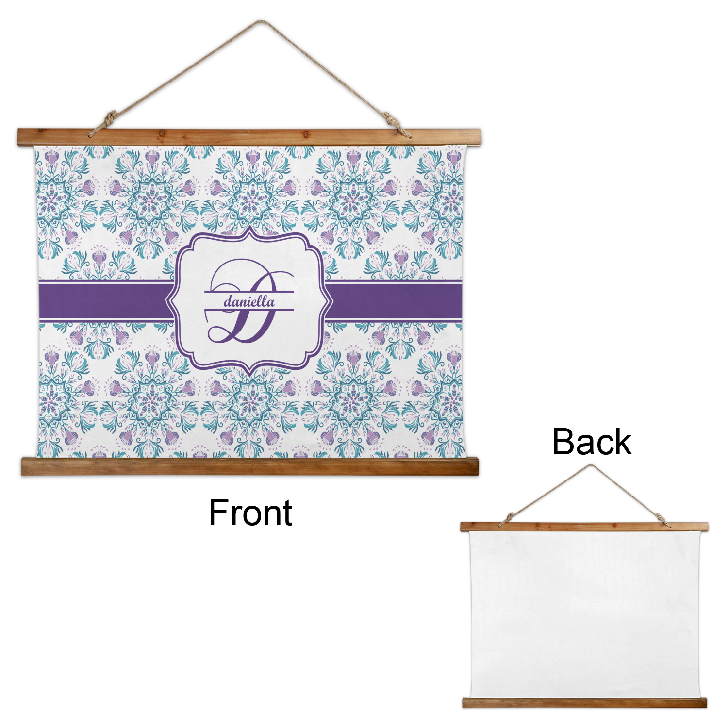 Made in two different orientations - portrait or landscape - both are 26" x 36". Your design is printed on a high quality polyester fabric with hemmed edges. The wood on the top and bottom of the tapestry is 1.25" tall and 0.25" thick and there are two pieces on top and bottom which sandwich the fabric.