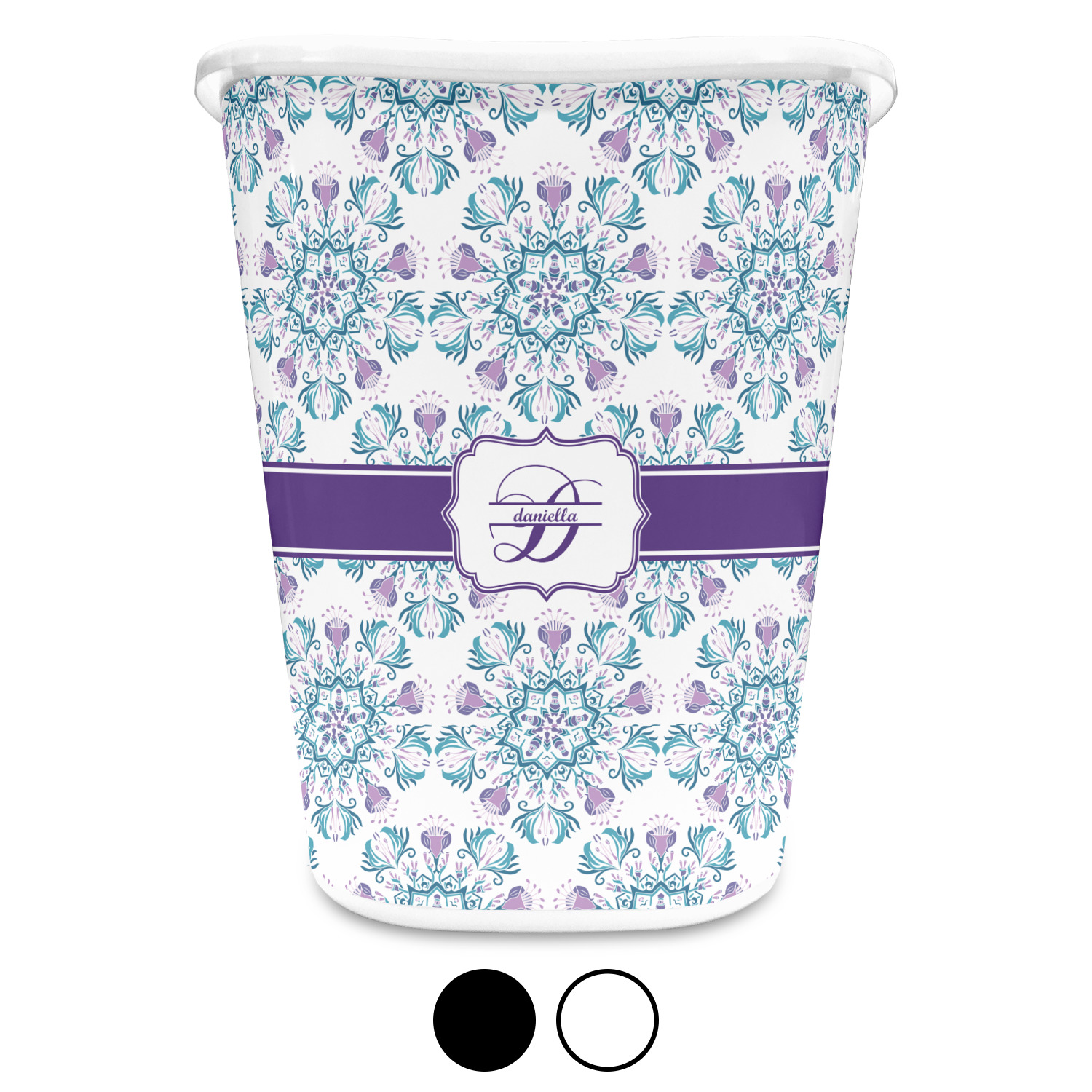 You can choose to purchase these decorative wastebaskets in either a white or a black color that will show on the base and the upper rim. Your customization is printed on a high-gloss, fine-quality vinyl adhesive, and you can choose to either have this adhesive applied to one side only or to both sides. As such, this plastic wastebasket can be single-sided or double-sided, depending on your creative vision. Your customization is printed using durable inks, making the design waterproof and resistant to fading over time.