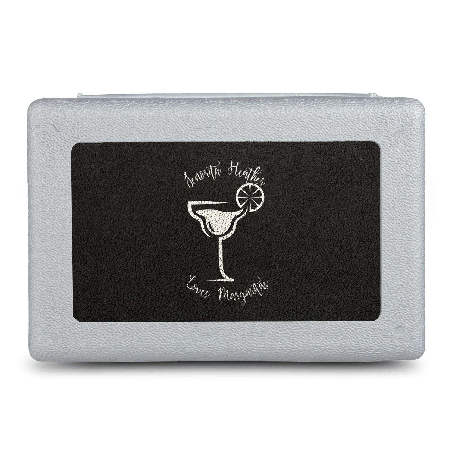 This margarita design has a lovely black illustration of a margarita glass with text inside saying "orange liqueur," "tequila," and "lime juice." Above and below this graphic is where your personalization goes. The pattern behind the graphic has a simpler margarita glass that is a light green while the rest of the pattern is a light lime green. This is a fun design to put on your beach, pool, or kitchen accessories.