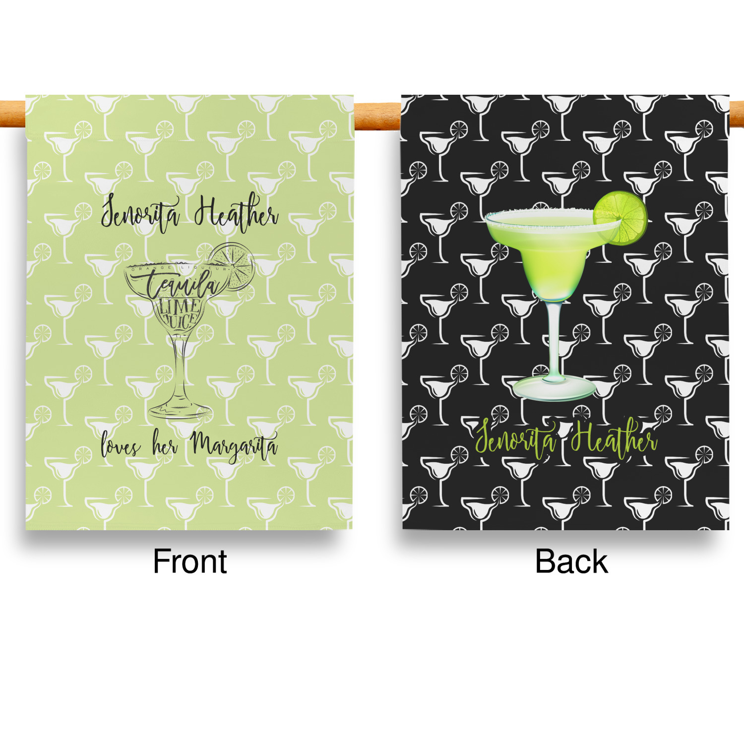 This margarita design has a lovely black illustration of a margarita glass with text inside saying "orange liqueur," "tequila," and "lime juice." Above and below this graphic is where your personalization goes. The pattern behind the graphic has a simpler margarita glass that is a light green while the rest of the pattern is a light lime green. This is a fun design to put on your beach, pool, or kitchen accessories.