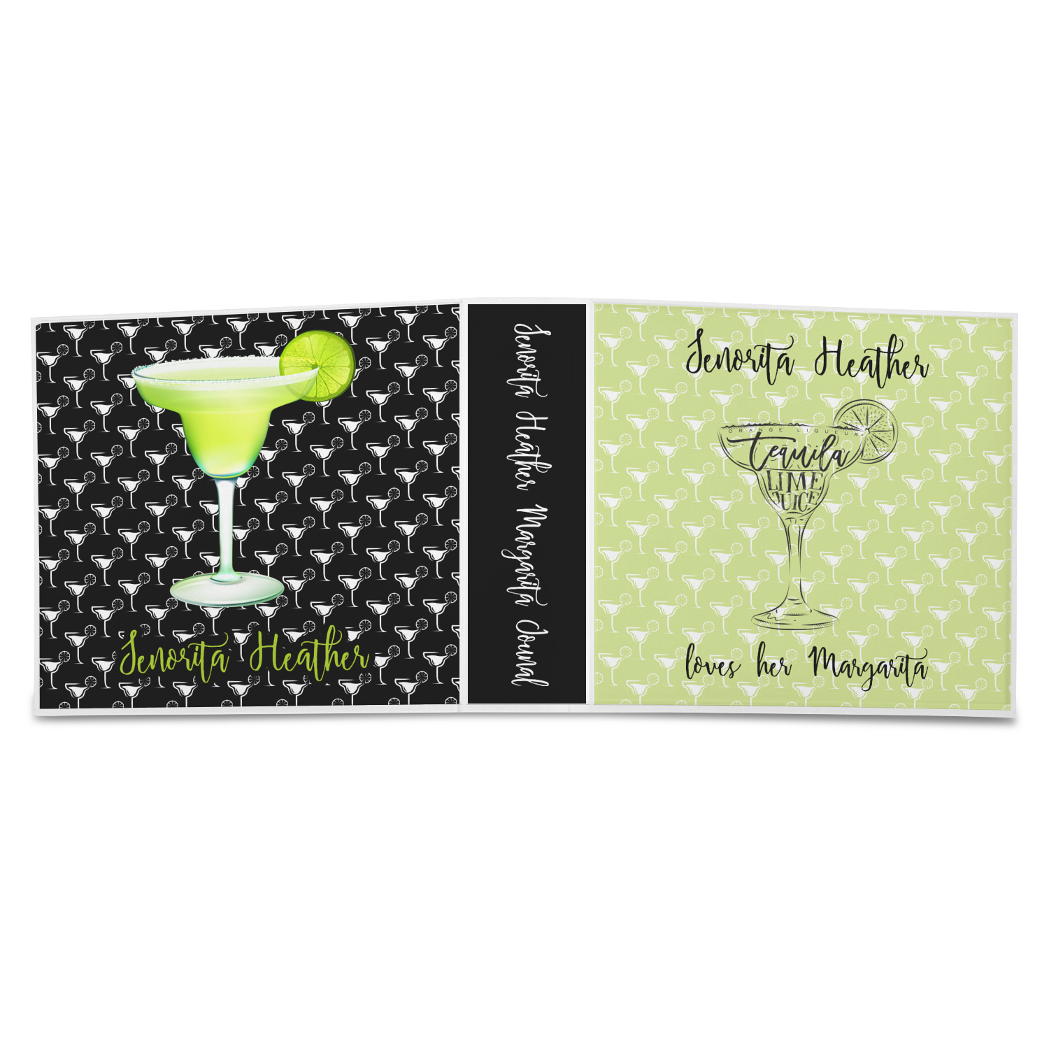 This margarita design has a lovely black illustration of a margarita glass with text inside saying "orange liqueur," "tequila," and "lime juice." Above and below this graphic is where your personalization goes. The pattern behind the graphic has a simpler margarita glass that is a light green while the rest of the pattern is a light lime green. This is a fun design to put on your beach, pool, or kitchen accessories.