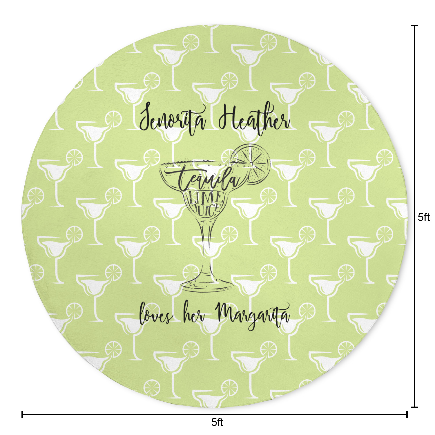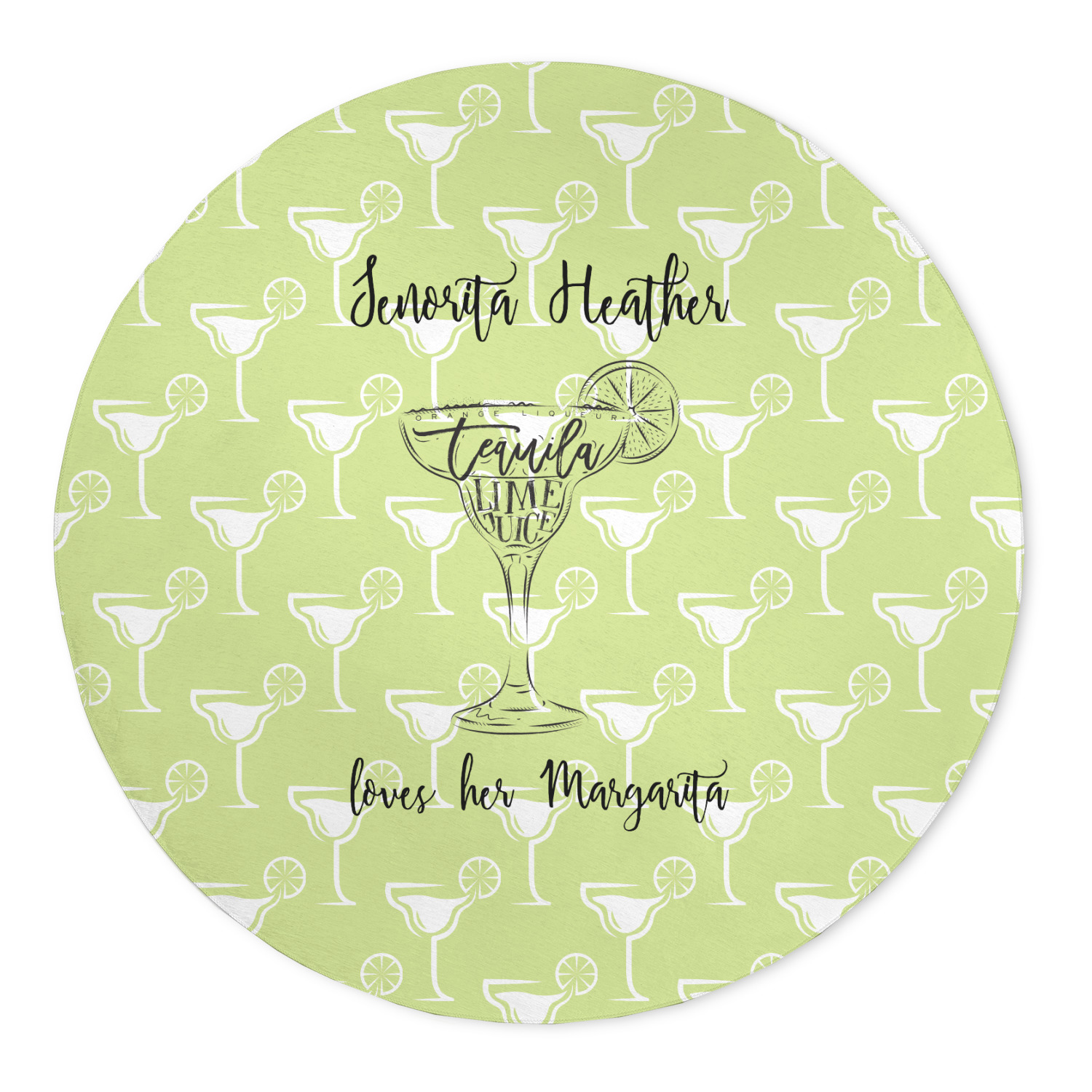 This margarita design has a lovely black illustration of a margarita glass with text inside saying "orange liqueur," "tequila," and "lime juice." Above and below this graphic is where your personalization goes. The pattern behind the graphic has a simpler margarita glass that is a light green while the rest of the pattern is a light lime green. This is a fun design to put on your beach, pool, or kitchen accessories.
