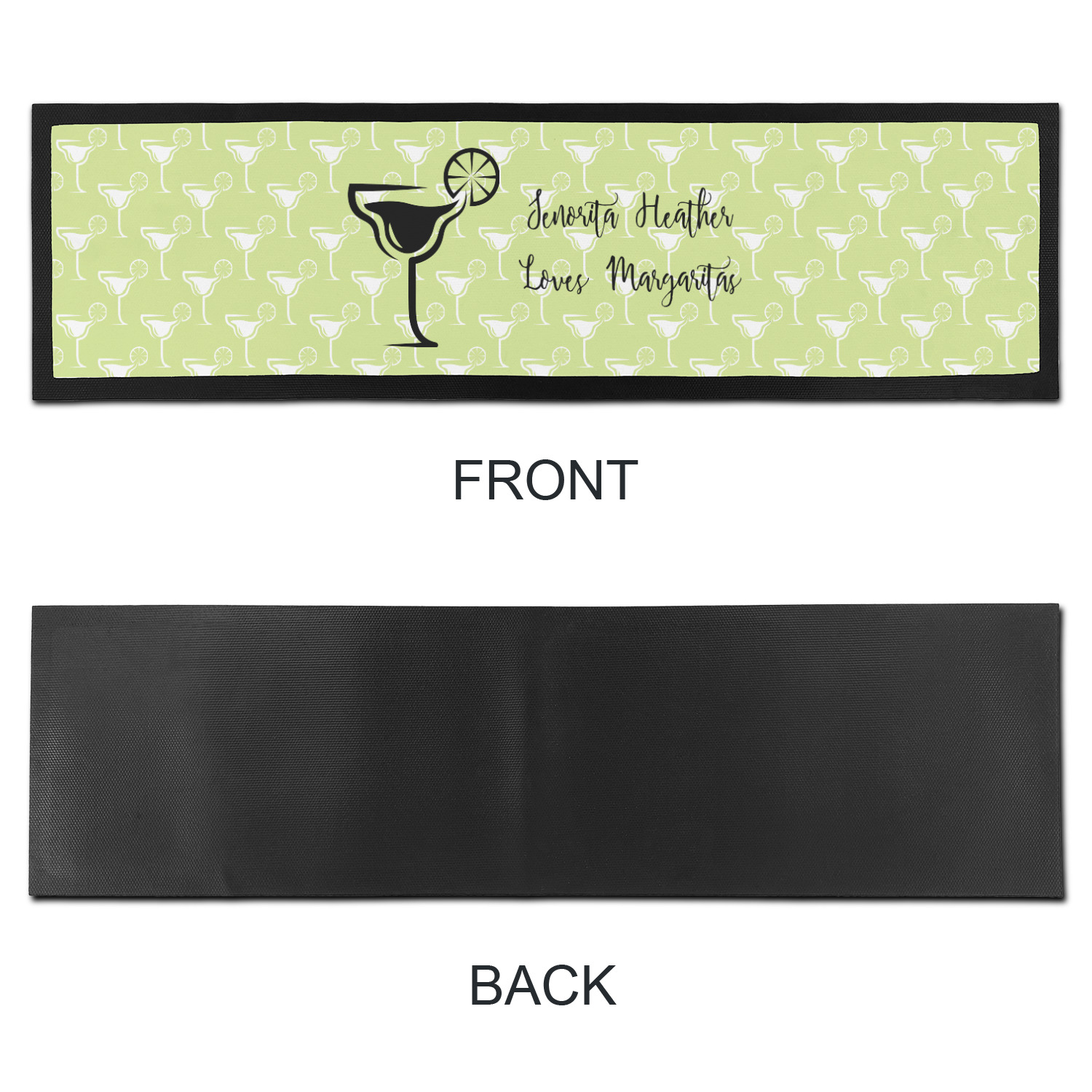 This margarita design has a lovely black illustration of a margarita glass with text inside saying "orange liqueur," "tequila," and "lime juice." Above and below this graphic is where your personalization goes. The pattern behind the graphic has a simpler margarita glass that is a light green while the rest of the pattern is a light lime green. This is a fun design to put on your beach, pool, or kitchen accessories.