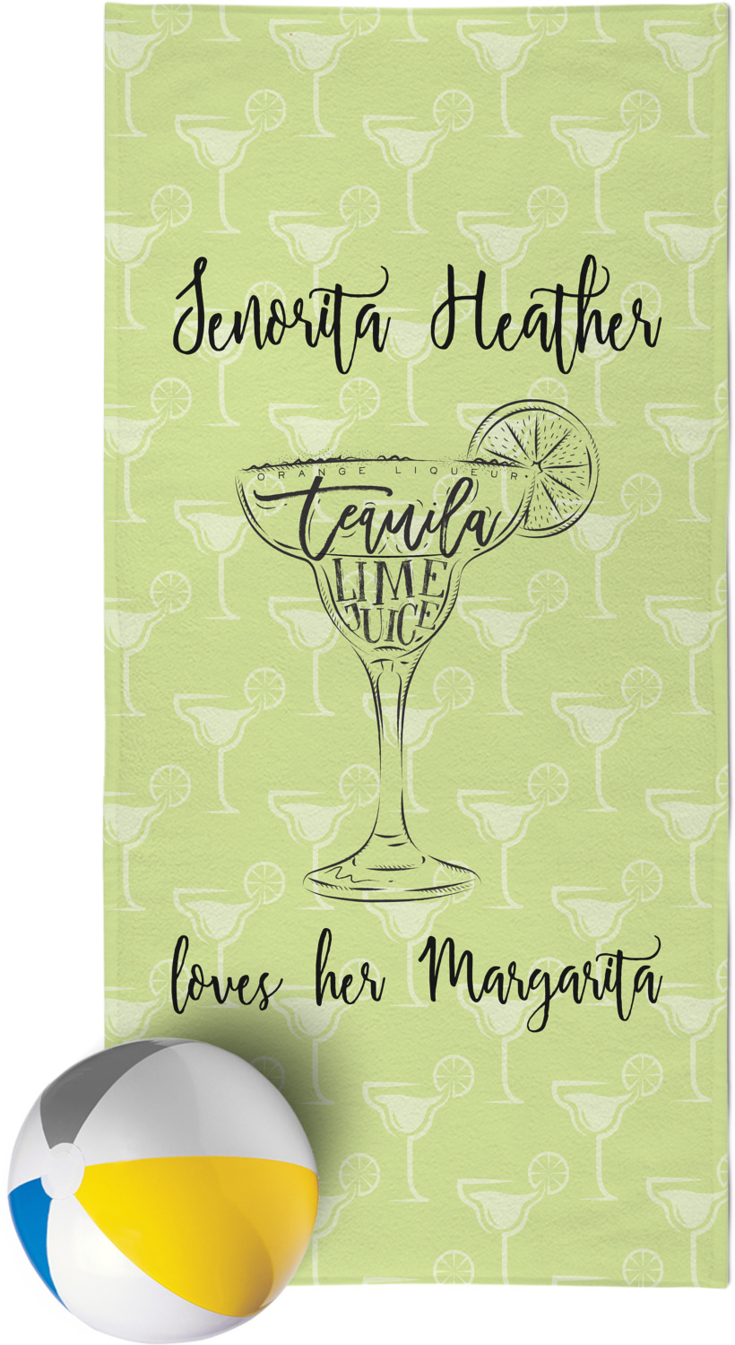 This margarita design has a lovely black illustration of a margarita glass with text inside saying "orange liqueur," "tequila," and "lime juice." Above and below this graphic is where your personalization goes. The pattern behind the graphic has a simpler margarita glass that is a light green while the rest of the pattern is a light lime green. This is a fun design to put on your beach, pool, or kitchen accessories.