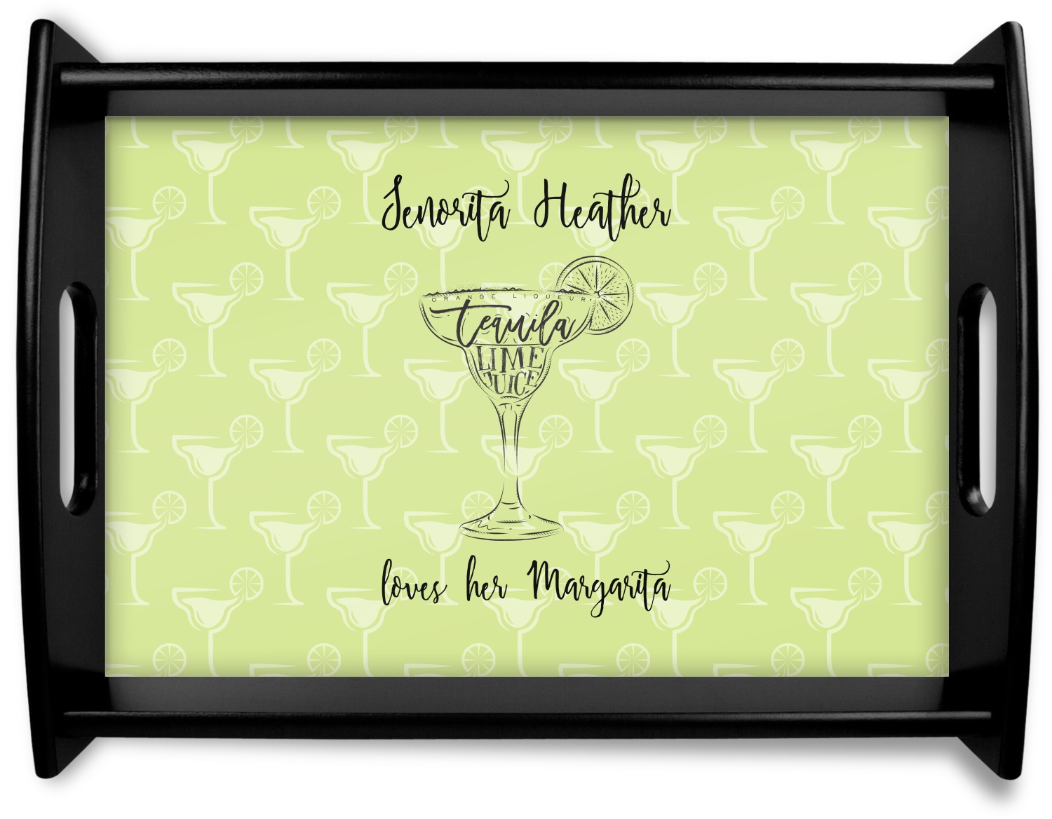 This margarita design has a lovely black illustration of a margarita glass with text inside saying "orange liqueur," "tequila," and "lime juice." Above and below this graphic is where your personalization goes. The pattern behind the graphic has a simpler margarita glass that is a light green while the rest of the pattern is a light lime green. This is a fun design to put on your beach, pool, or kitchen accessories.