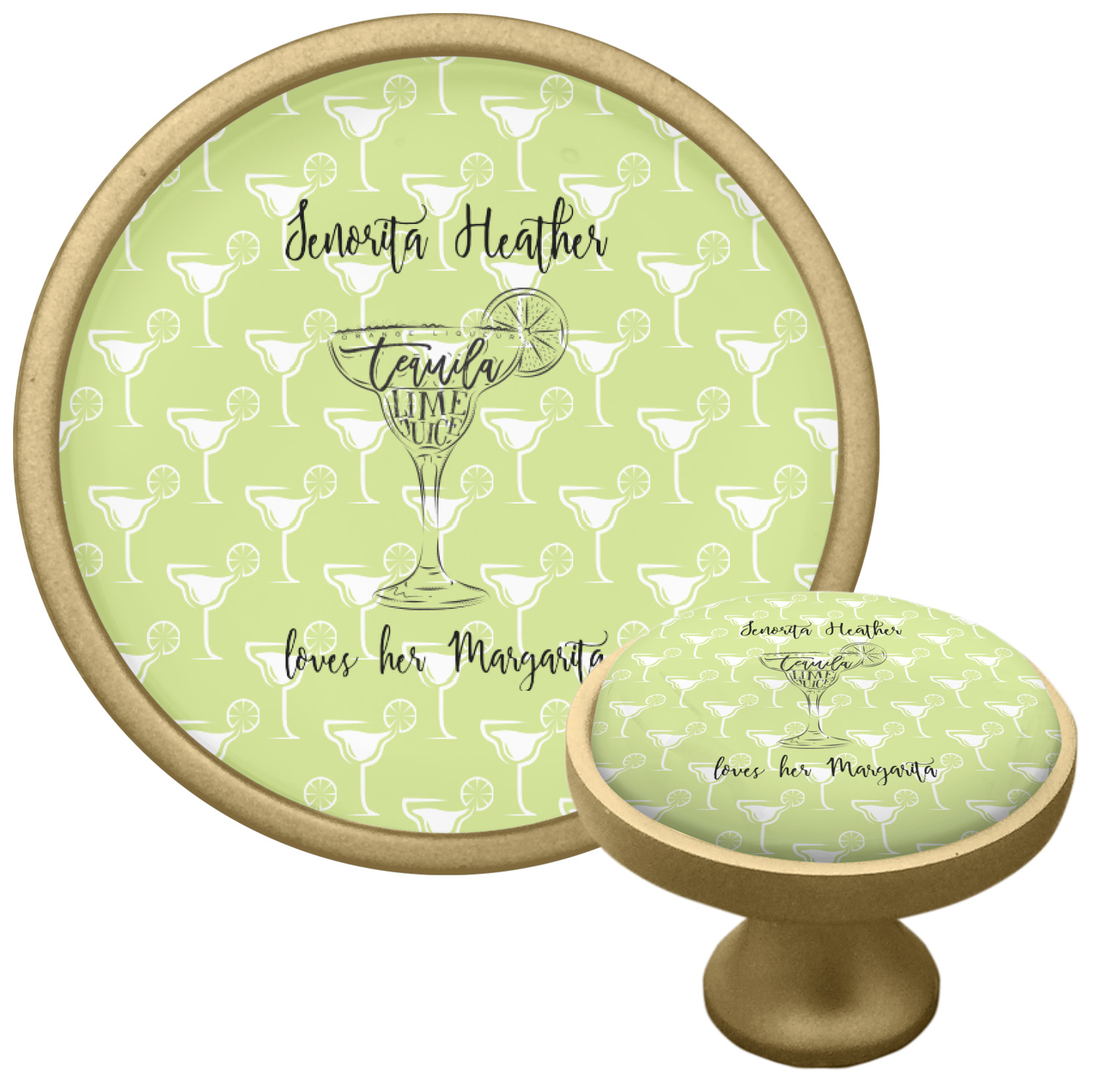 This margarita design has a lovely black illustration of a margarita glass with text inside saying "orange liqueur," "tequila," and "lime juice." Above and below this graphic is where your personalization goes. The pattern behind the graphic has a simpler margarita glass that is a light green while the rest of the pattern is a light lime green. This is a fun design to put on your beach, pool, or kitchen accessories.