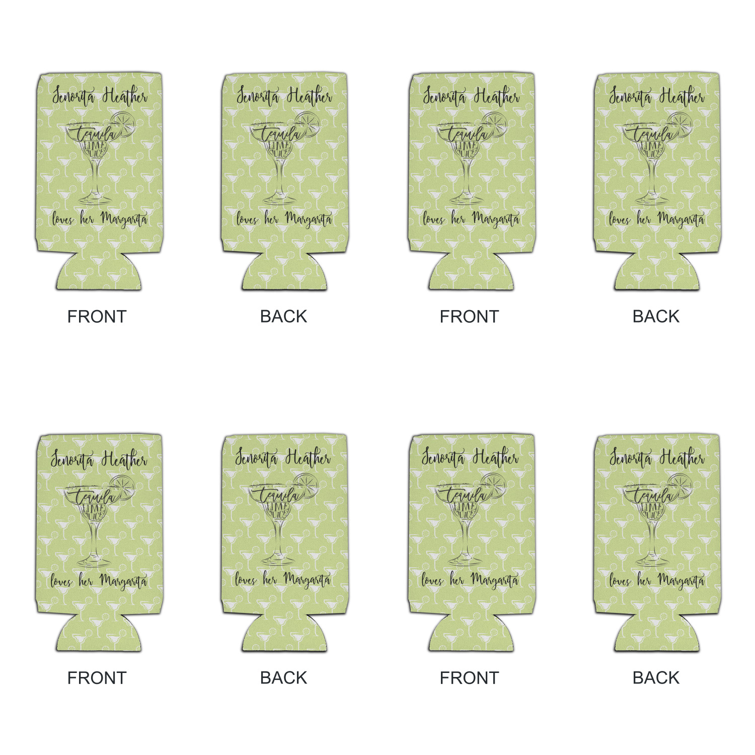 This margarita design has a lovely black illustration of a margarita glass with text inside saying "orange liqueur," "tequila," and "lime juice." Above and below this graphic is where your personalization goes. The pattern behind the graphic has a simpler margarita glass that is a light green while the rest of the pattern is a light lime green. This is a fun design to put on your beach, pool, or kitchen accessories.