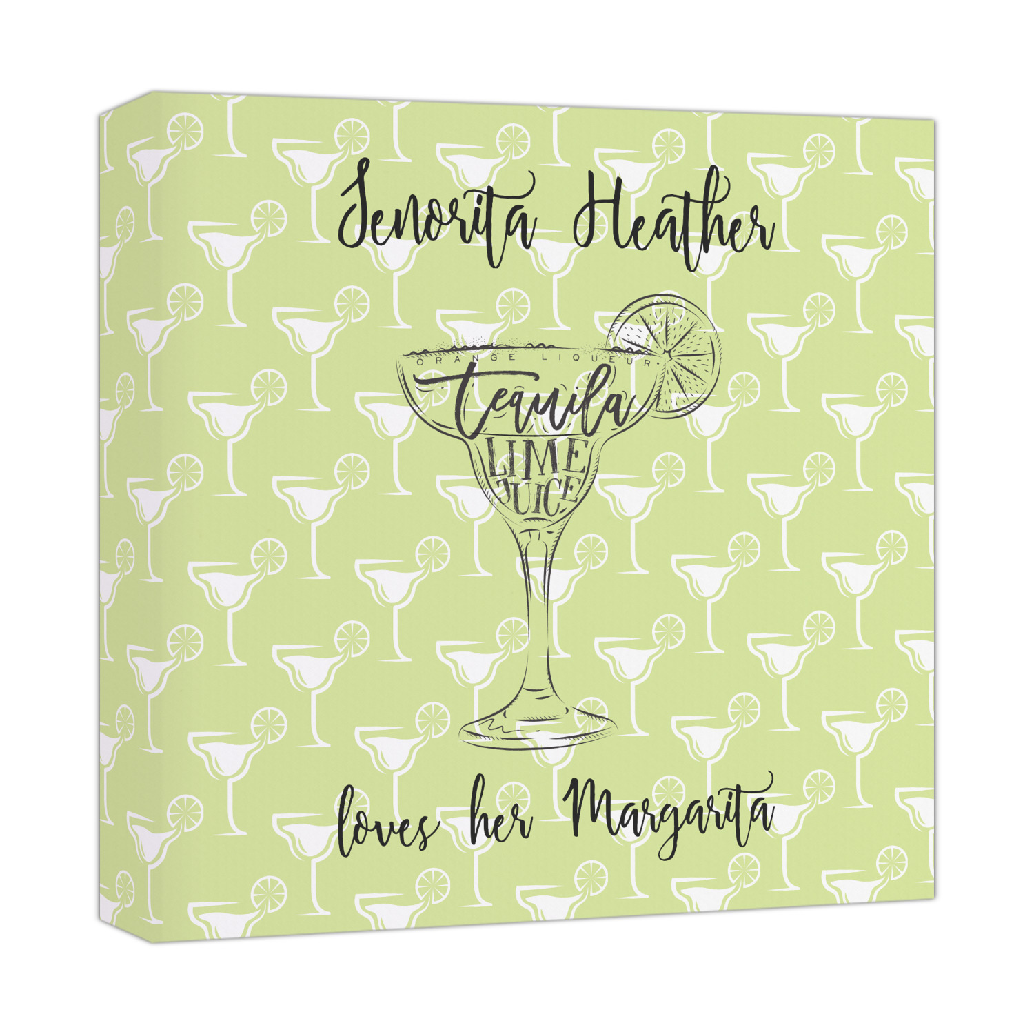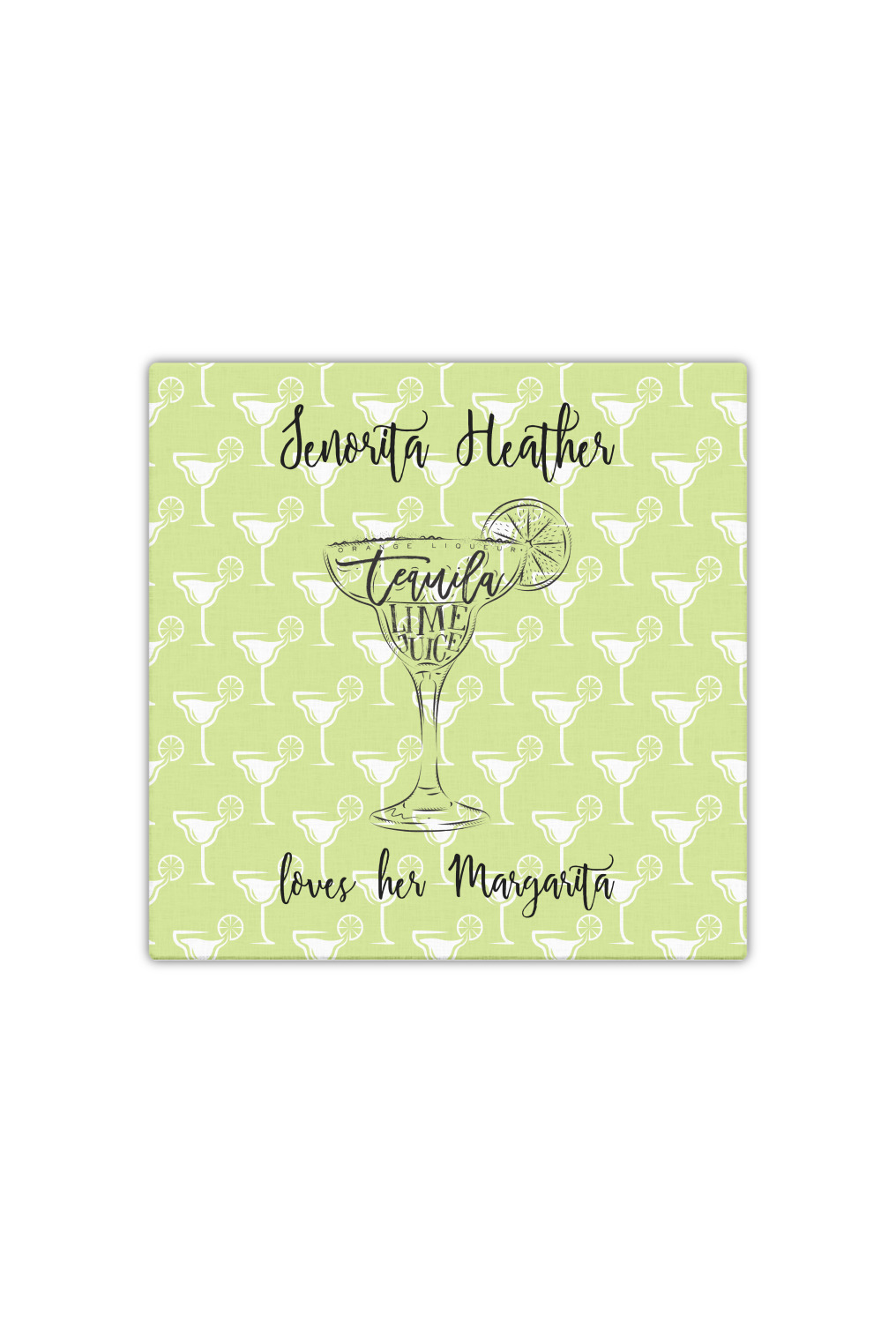 This margarita design has a lovely black illustration of a margarita glass with text inside saying "orange liqueur," "tequila," and "lime juice." Above and below this graphic is where your personalization goes. The pattern behind the graphic has a simpler margarita glass that is a light green while the rest of the pattern is a light lime green. This is a fun design to put on your beach, pool, or kitchen accessories.