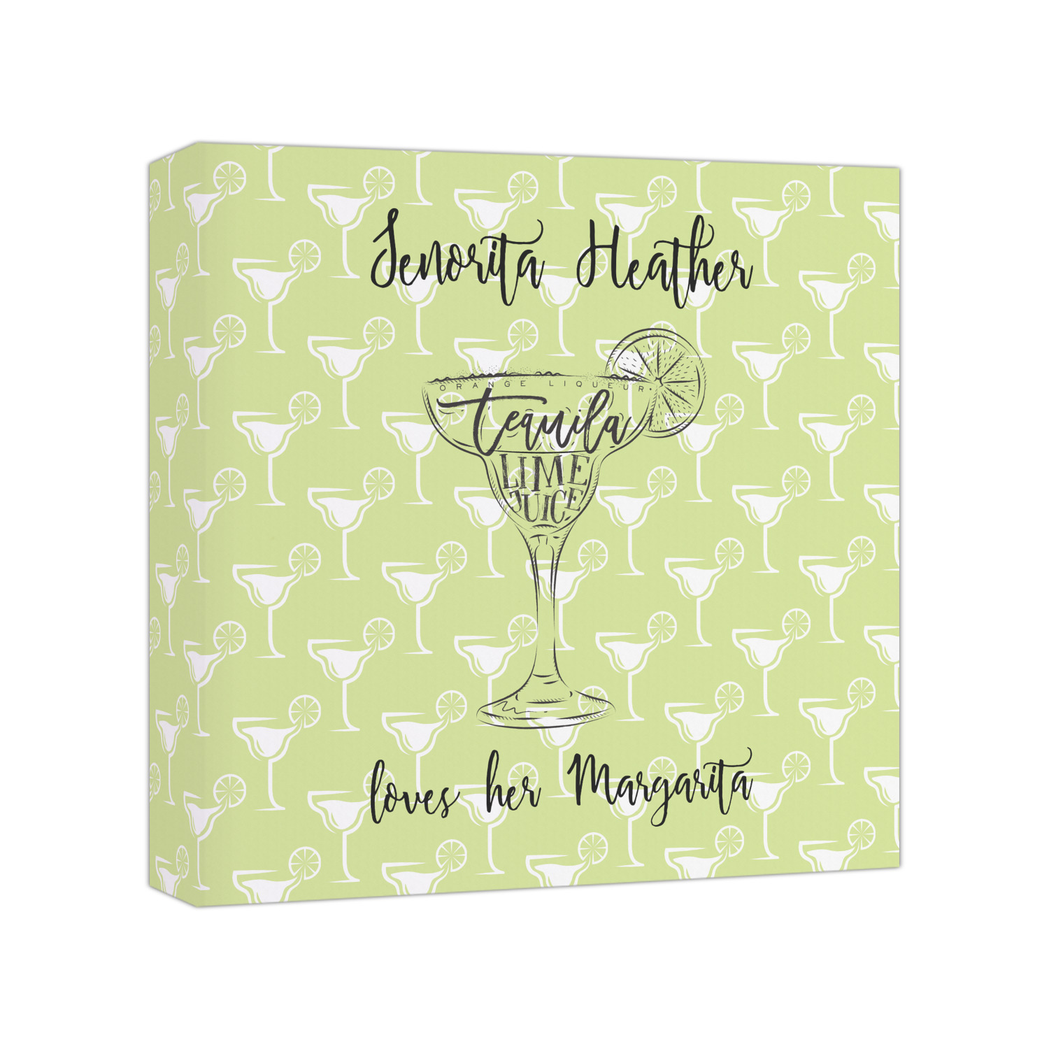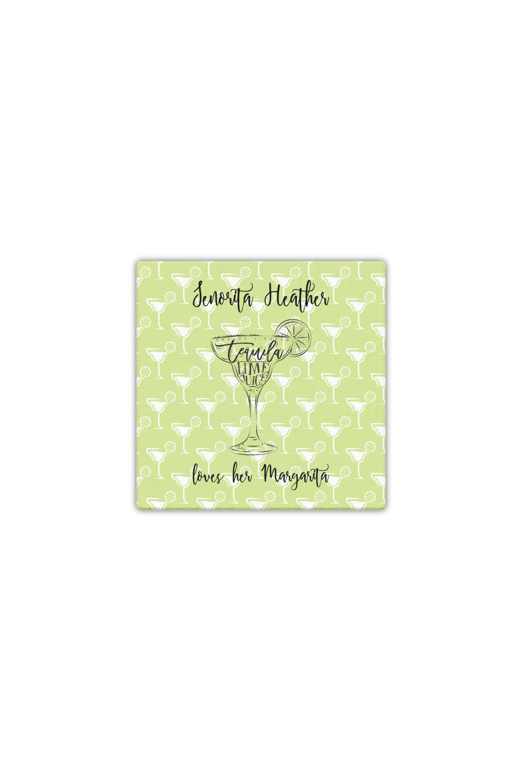 This margarita design has a lovely black illustration of a margarita glass with text inside saying "orange liqueur," "tequila," and "lime juice." Above and below this graphic is where your personalization goes. The pattern behind the graphic has a simpler margarita glass that is a light green while the rest of the pattern is a light lime green. This is a fun design to put on your beach, pool, or kitchen accessories.