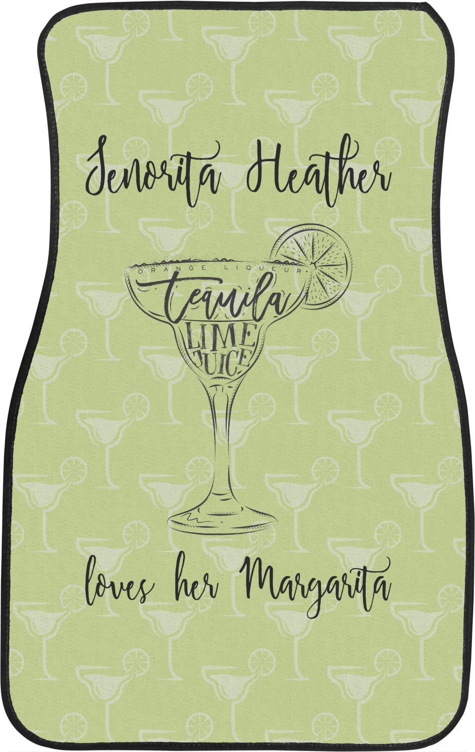 This margarita design has a lovely black illustration of a margarita glass with text inside saying "orange liqueur," "tequila," and "lime juice." Above and below this graphic is where your personalization goes. The pattern behind the graphic has a simpler margarita glass that is a light green while the rest of the pattern is a light lime green. This is a fun design to put on your beach, pool, or kitchen accessories.