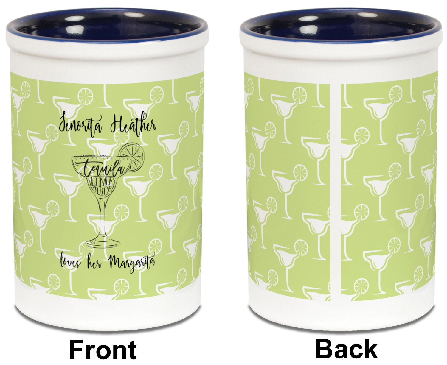 This margarita design has a lovely black illustration of a margarita glass with text inside saying "orange liqueur," "tequila," and "lime juice." Above and below this graphic is where your personalization goes. The pattern behind the graphic has a simpler margarita glass that is a light green while the rest of the pattern is a light lime green. This is a fun design to put on your beach, pool, or kitchen accessories.