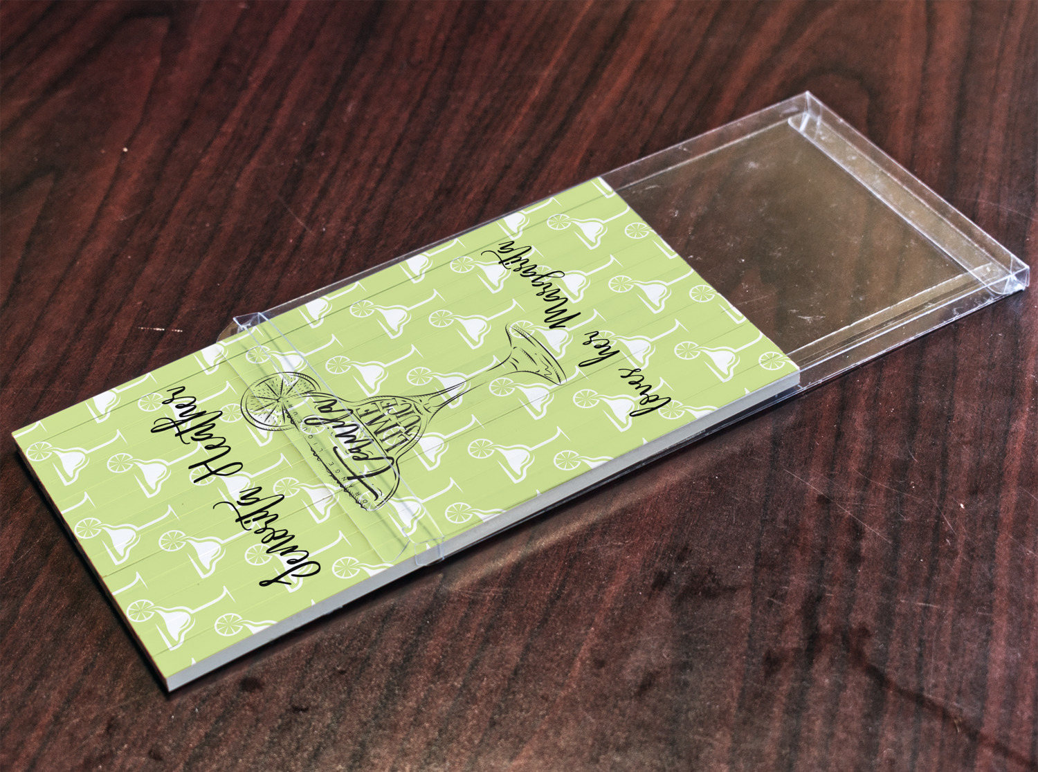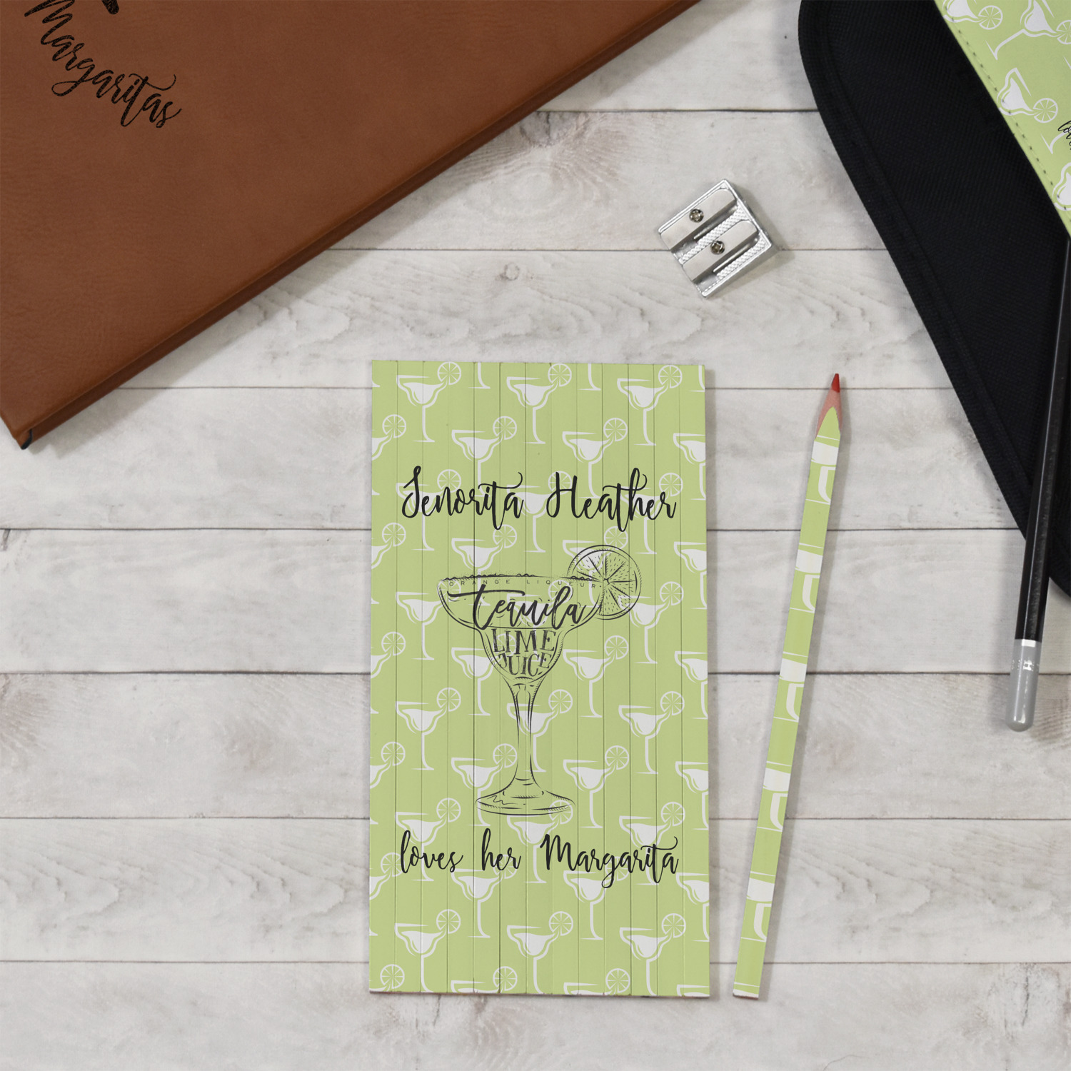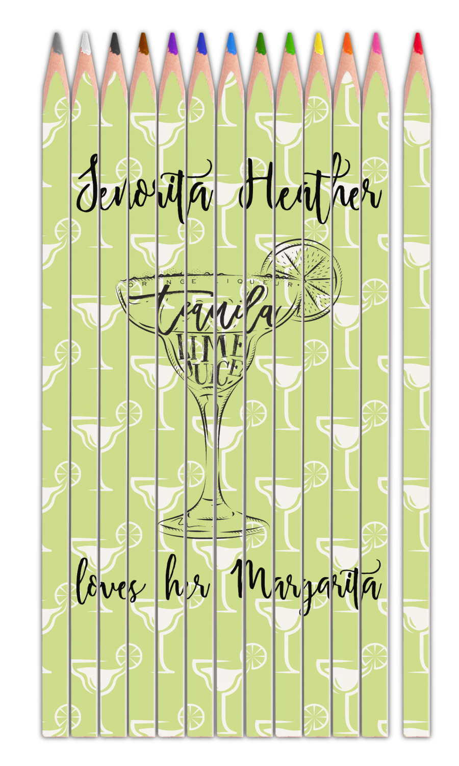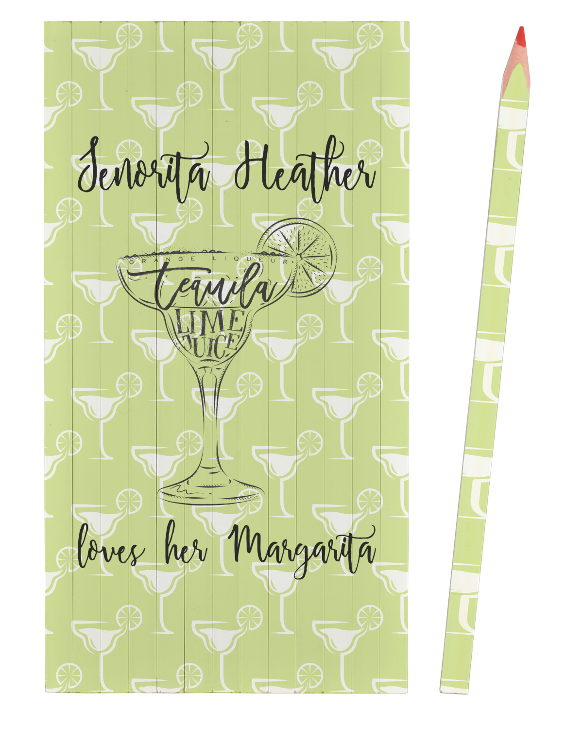 This margarita design has a lovely black illustration of a margarita glass with text inside saying "orange liqueur," "tequila," and "lime juice." Above and below this graphic is where your personalization goes. The pattern behind the graphic has a simpler margarita glass that is a light green while the rest of the pattern is a light lime green. This is a fun design to put on your beach, pool, or kitchen accessories.