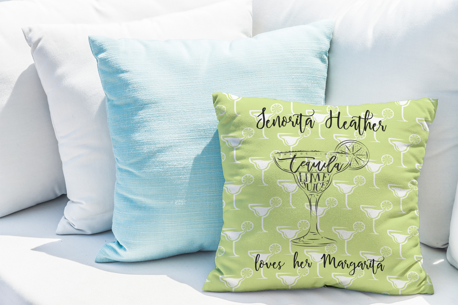 This margarita design has a lovely black illustration of a margarita glass with text inside saying "orange liqueur," "tequila," and "lime juice." Above and below this graphic is where your personalization goes. The pattern behind the graphic has a simpler margarita glass that is a light green while the rest of the pattern is a light lime green. This is a fun design to put on your beach, pool, or kitchen accessories.