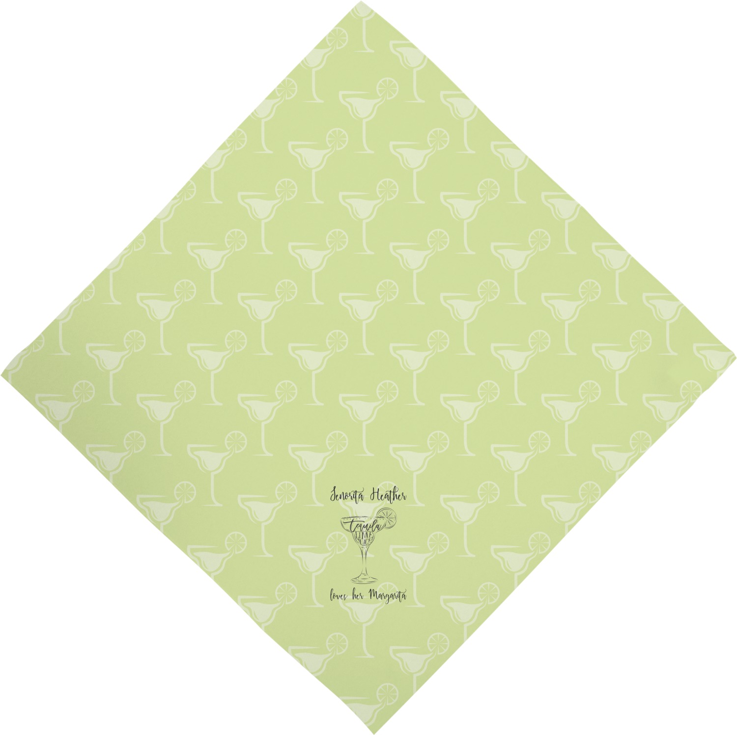 This margarita design has a lovely black illustration of a margarita glass with text inside saying "orange liqueur," "tequila," and "lime juice." Above and below this graphic is where your personalization goes. The pattern behind the graphic has a simpler margarita glass that is a light green while the rest of the pattern is a light lime green. This is a fun design to put on your beach, pool, or kitchen accessories.