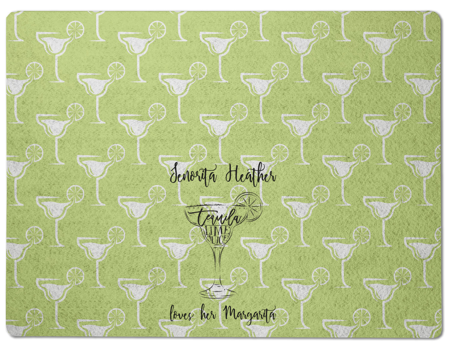 This margarita design has a lovely black illustration of a margarita glass with text inside saying "orange liqueur," "tequila," and "lime juice." Above and below this graphic is where your personalization goes. The pattern behind the graphic has a simpler margarita glass that is a light green while the rest of the pattern is a light lime green. This is a fun design to put on your beach, pool, or kitchen accessories.