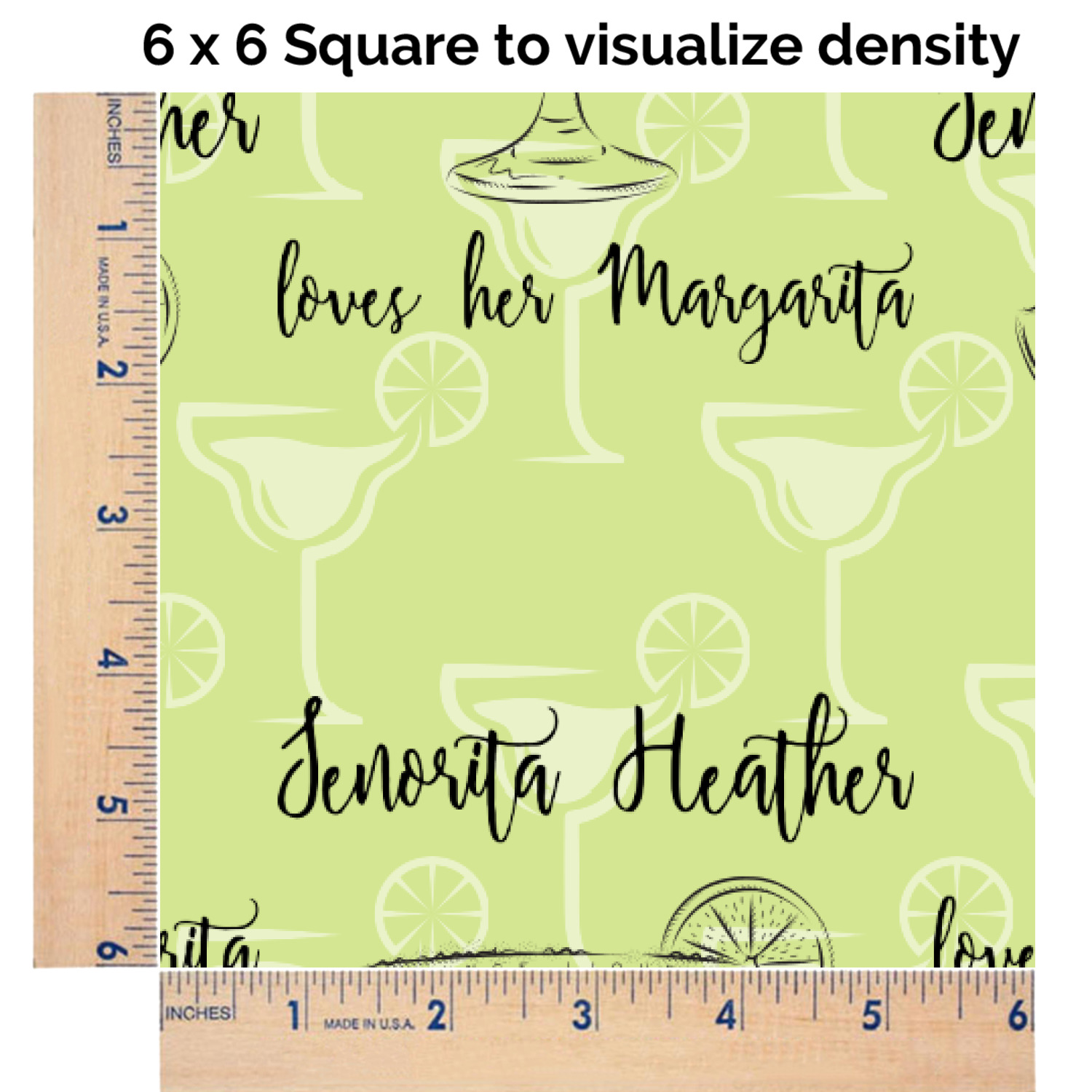 This margarita design has a lovely black illustration of a margarita glass with text inside saying "orange liqueur," "tequila," and "lime juice." Above and below this graphic is where your personalization goes. The pattern behind the graphic has a simpler margarita glass that is a light green while the rest of the pattern is a light lime green. This is a fun design to put on your beach, pool, or kitchen accessories.