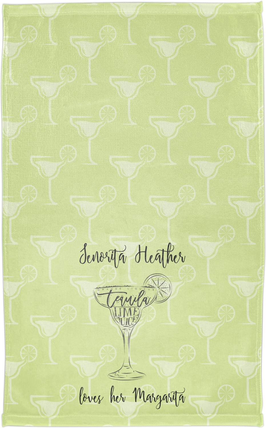 This margarita design has a lovely black illustration of a margarita glass with text inside saying "orange liqueur," "tequila," and "lime juice." Above and below this graphic is where your personalization goes. The pattern behind the graphic has a simpler margarita glass that is a light green while the rest of the pattern is a light lime green. This is a fun design to put on your beach, pool, or kitchen accessories.