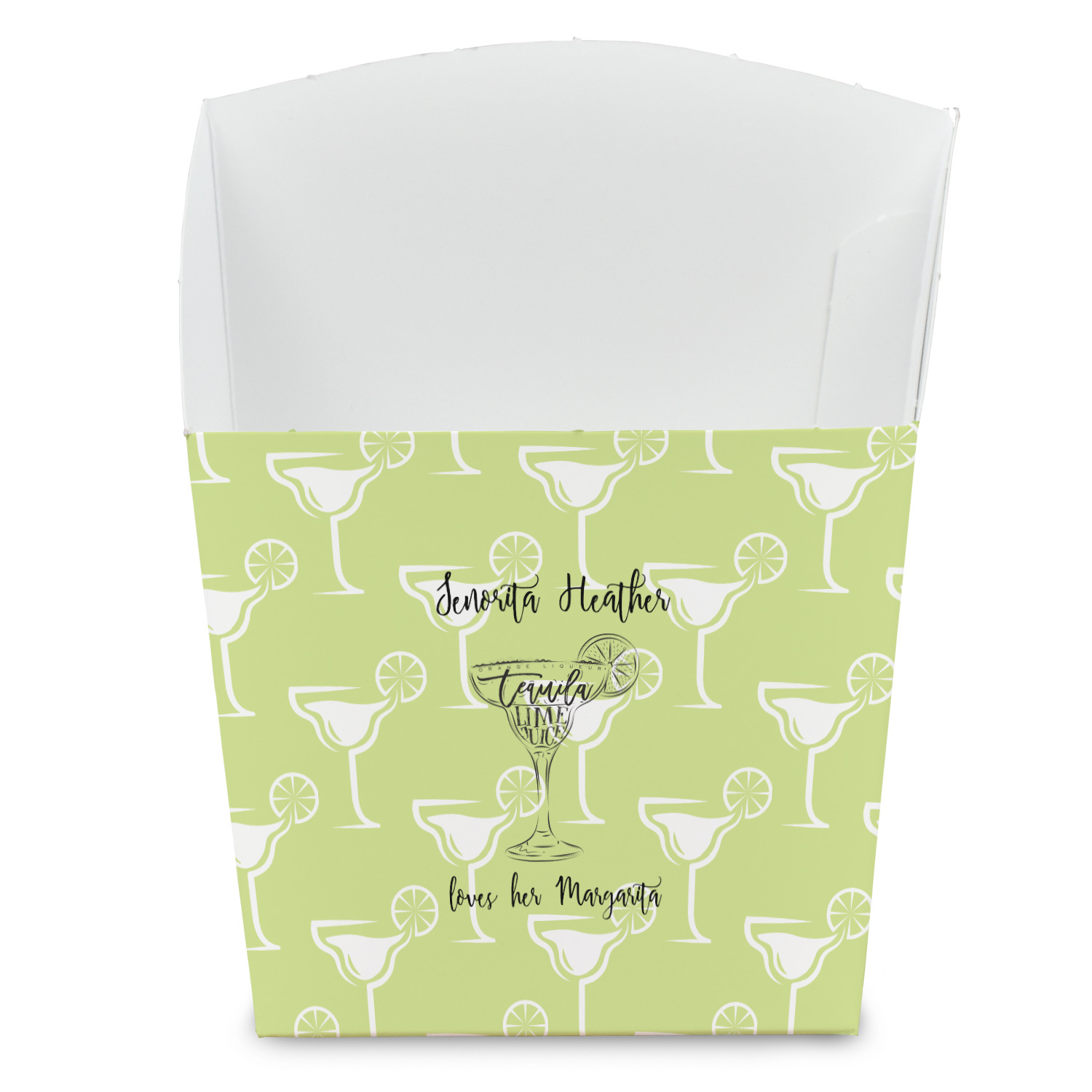 Since it is an open box, it works very well as a party snack cup (instead of plates) for different types of dry snacks and treats such as popcorn, cheezies, pretzels, chips, twizzlers, etc. This box can easily be carried with a drink all in one hand!