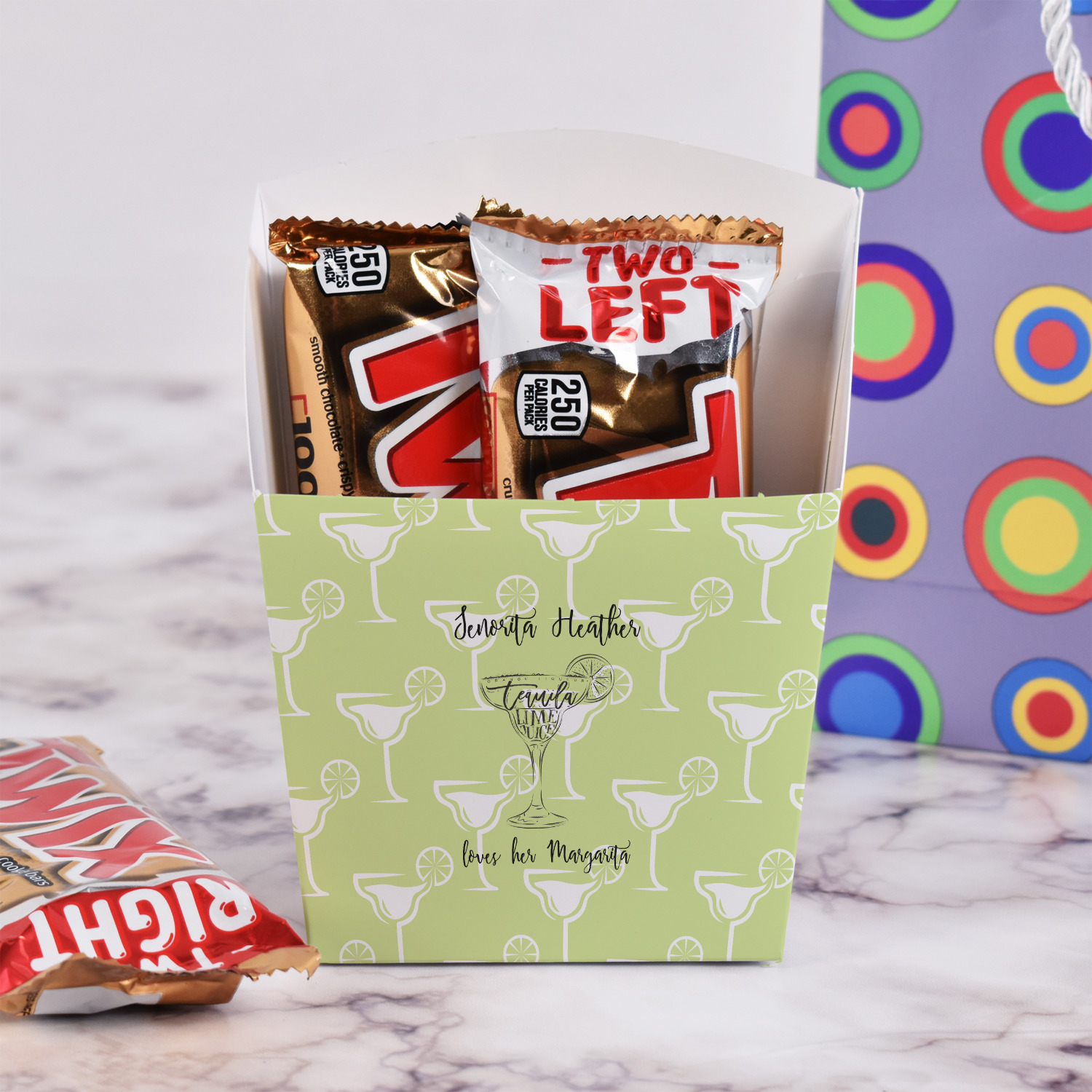These french fry favor boxes are a pretty good size i.e. 5.25" tall x 4.25" wide x 1..625" deep. If you are not good with dimensions - it easily fits 2 full size Twix bars, or it is the size of McDonald's large fries.