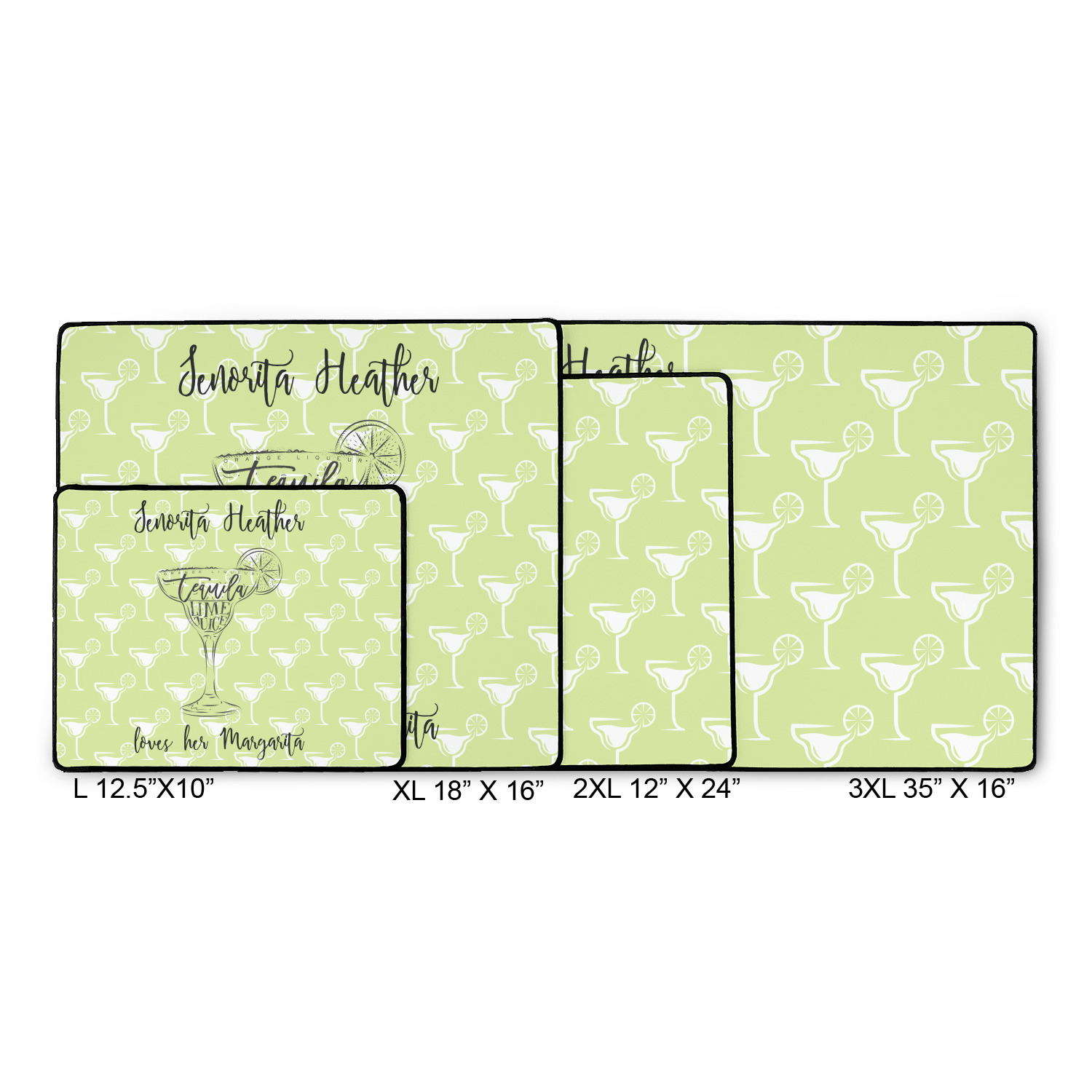 This margarita design has a lovely black illustration of a margarita glass with text inside saying "orange liqueur," "tequila," and "lime juice." Above and below this graphic is where your personalization goes. The pattern behind the graphic has a simpler margarita glass that is a light green while the rest of the pattern is a light lime green. This is a fun design to put on your beach, pool, or kitchen accessories.