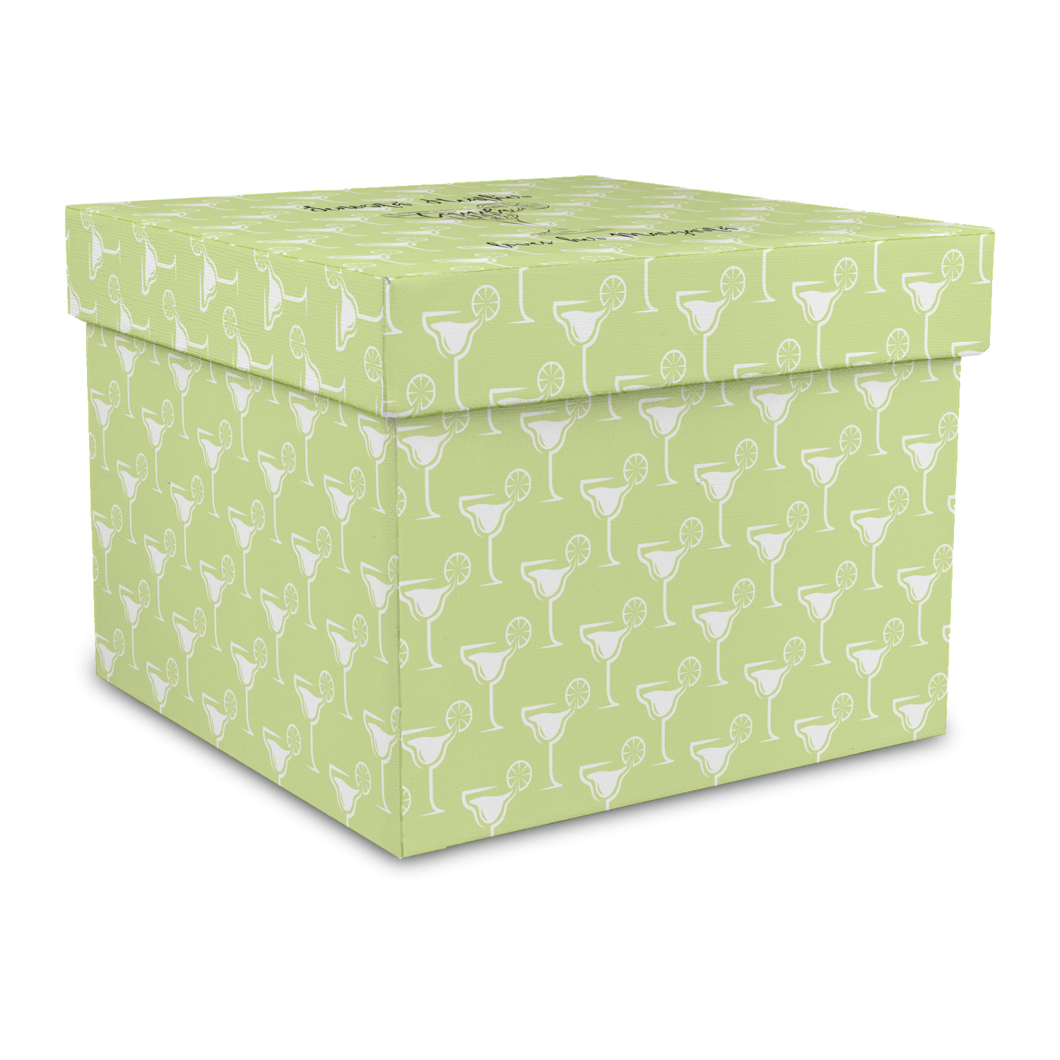 This margarita design has a lovely black illustration of a margarita glass with text inside saying "orange liqueur," "tequila," and "lime juice." Above and below this graphic is where your personalization goes. The pattern behind the graphic has a simpler margarita glass that is a light green while the rest of the pattern is a light lime green. This is a fun design to put on your beach, pool, or kitchen accessories.