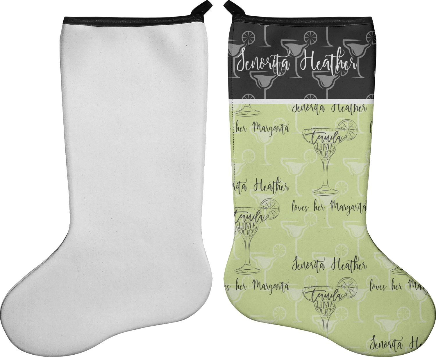 These 17" x 11" stockings are made of neoprene and have a black trim to give them a fantastic finished look. Your very own design is printed right onto the stocking, either single sided with white on the back or double sided where can use the same or different designs / patterns on the front and the back - the choice is yours. At the top of the stocking is a 2" loop for hanging.