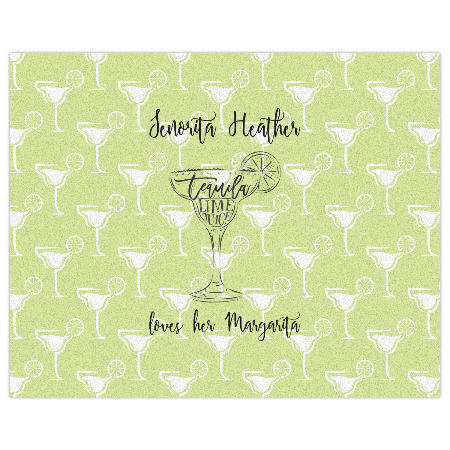 This margarita design has a lovely black illustration of a margarita glass with text inside saying "orange liqueur," "tequila," and "lime juice." Above and below this graphic is where your personalization goes. The pattern behind the graphic has a simpler margarita glass that is a light green while the rest of the pattern is a light lime green. This is a fun design to put on your beach, pool, or kitchen accessories.