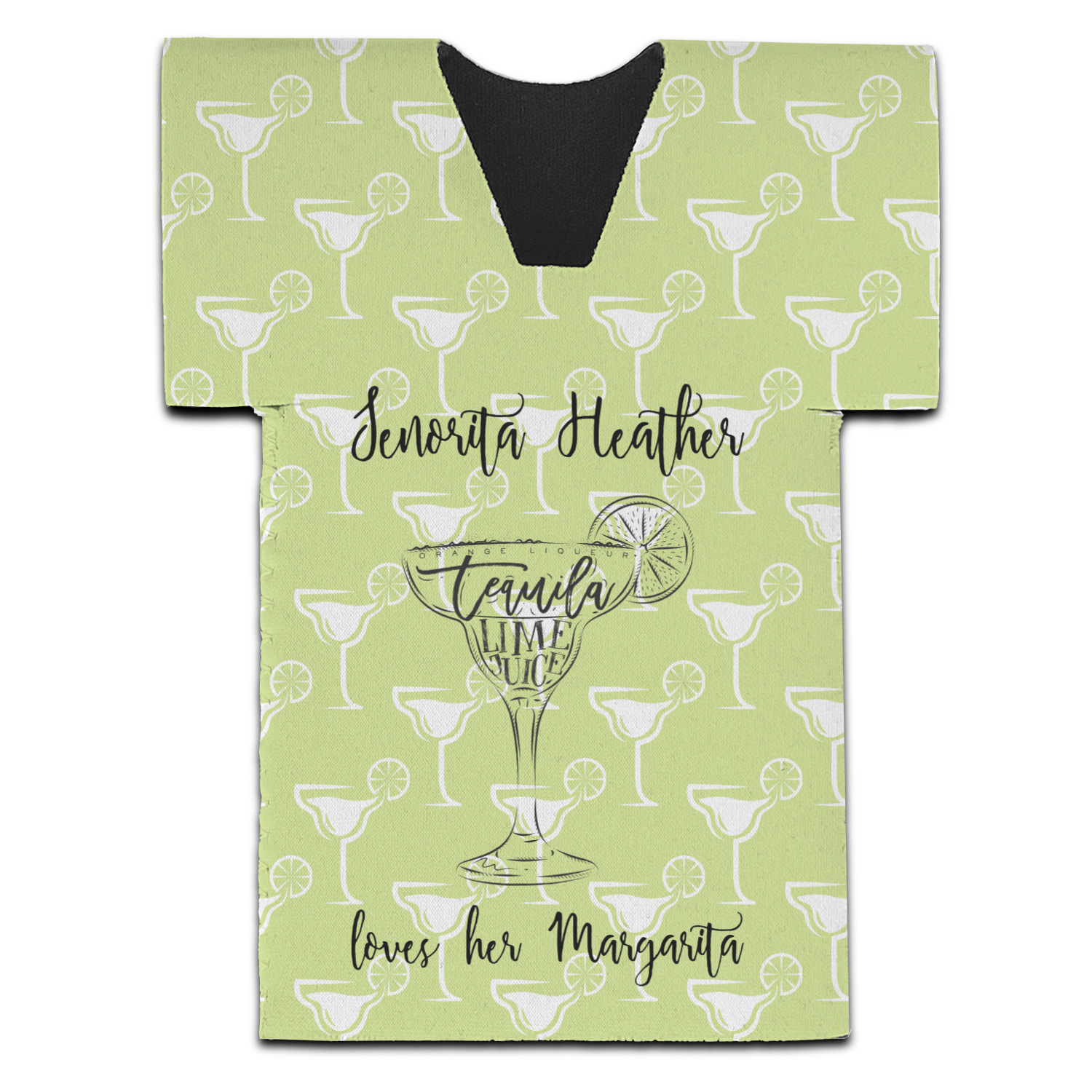 This margarita design has a lovely black illustration of a margarita glass with text inside saying "orange liqueur," "tequila," and "lime juice." Above and below this graphic is where your personalization goes. The pattern behind the graphic has a simpler margarita glass that is a light green while the rest of the pattern is a light lime green. This is a fun design to put on your beach, pool, or kitchen accessories.